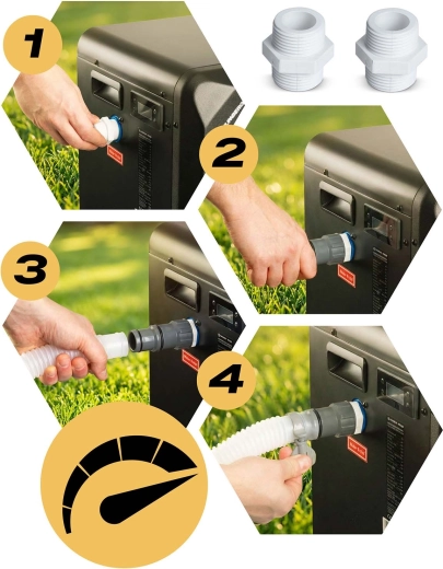 Univerzálne závitové koncovky, tesnenia, hadice a spony v balení umožnia rýchle a tesné pripojenie na bazénovú filtráciu bez zložitých úprav.