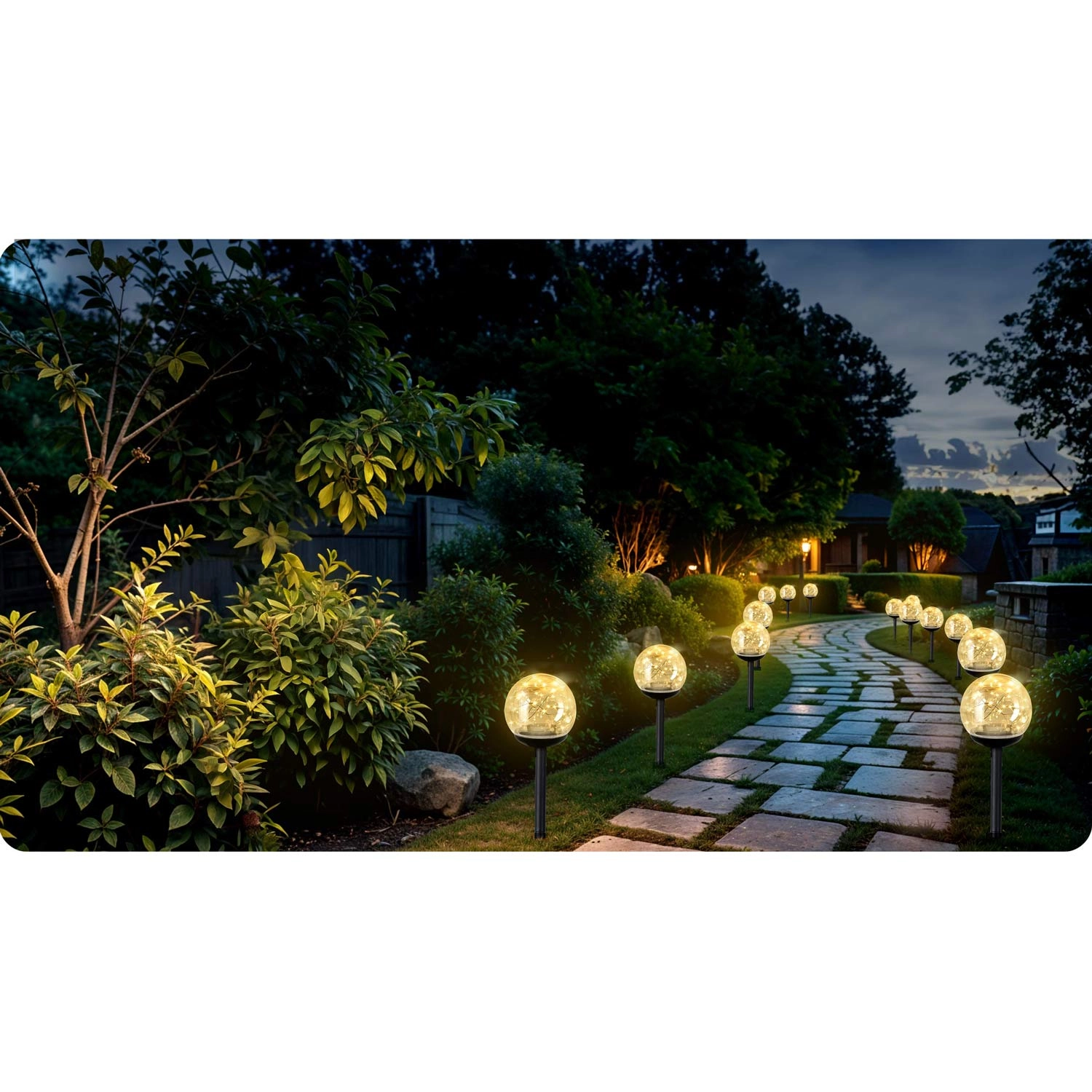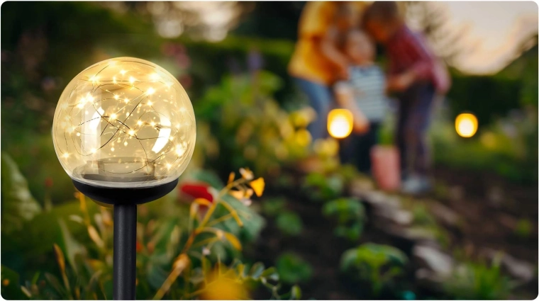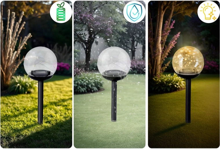 Priehľadné glóby s teplými LED bodmi krásne rozptyľujú svetlo a zvýraznia krivky chodníkov či záhonov. Ideálne na orientáciu a príjemnú atmosféru za súmraku.