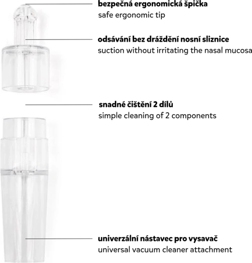 Priehľadný nadstavec a stabilný podtlak pomáhajú rýchlo uvoľniť nosové dutiny bez podráždenia sliznice – vhodné už od narodenia.