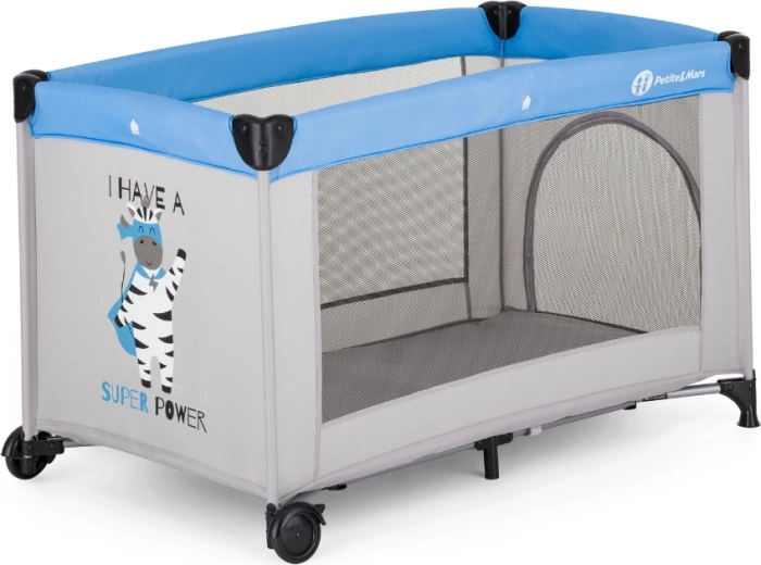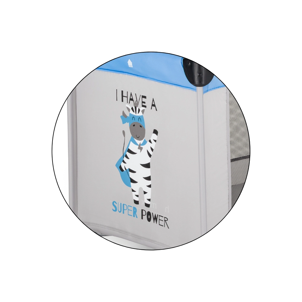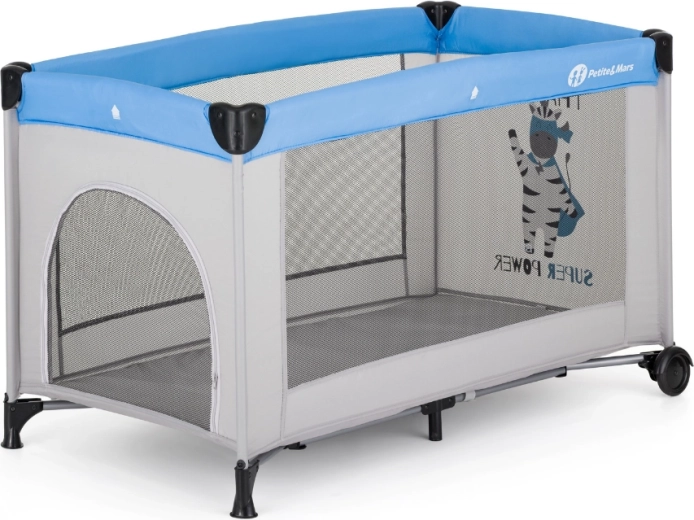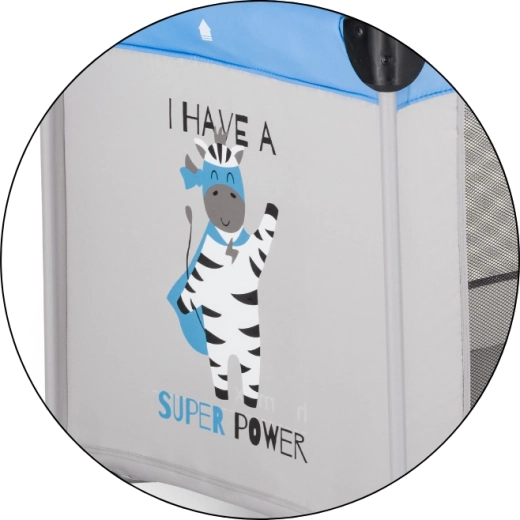 Cestovná postieľka PETITE&MARS Koot v hravom dizajne Zebra Super Power ponúka bezpečné a pohodlné miesto na spánok aj hranie. Stabilná kovová konštrukcia s odolnou textíliou zaručuje dlhú životnosť, zatiaľ čo priedušné sieťované strany umožňujú skvelý dohľad nad dieťaťom a optimálne prúdenie vzduchu. Unikátny Double Lock bráni náhodnému zloženiu a zvyšuje bezpečnosť pri používaní.
