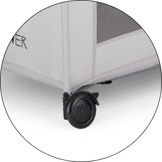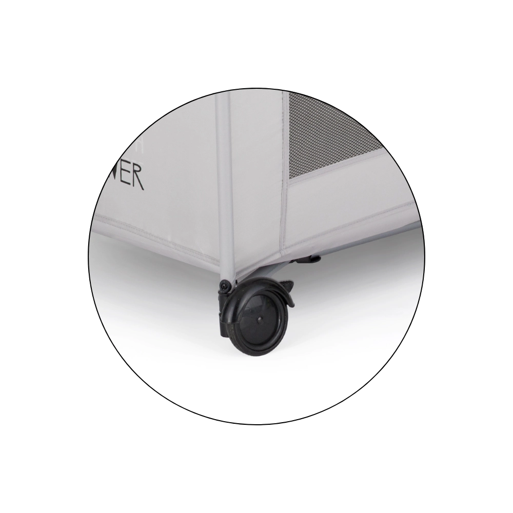 Postieľka sa rýchlo a jednoducho skladá do kompaktnej veľkosti. Dve kolieska uľahčujú presúvanie po miestnosti, čelné vchodové zipsové čelo zase umožní starším deťom bezpečný vstup a výstup. V balení nájdete skladaciu ležiacu plochu a prenosnú tašku pre pohodlné cestovanie. Pre novorodencov je možné dokúpiť prídavné poschodie pre vyššiu polohu lôžka.