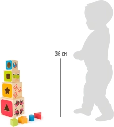 Každá kocka je zdobená veselými motívmi zvieratiek a výraznými farbami, ktoré motivujú k objavovaniu. Presné otvory vedú deti k trpezlivosti a sústredeniu a skladanie veže podporuje stabilitu ruky a priestorovú predstavivosť. Kvalitný drevený materiál je príjemný na dotyk a odolný na každodenné hranie.