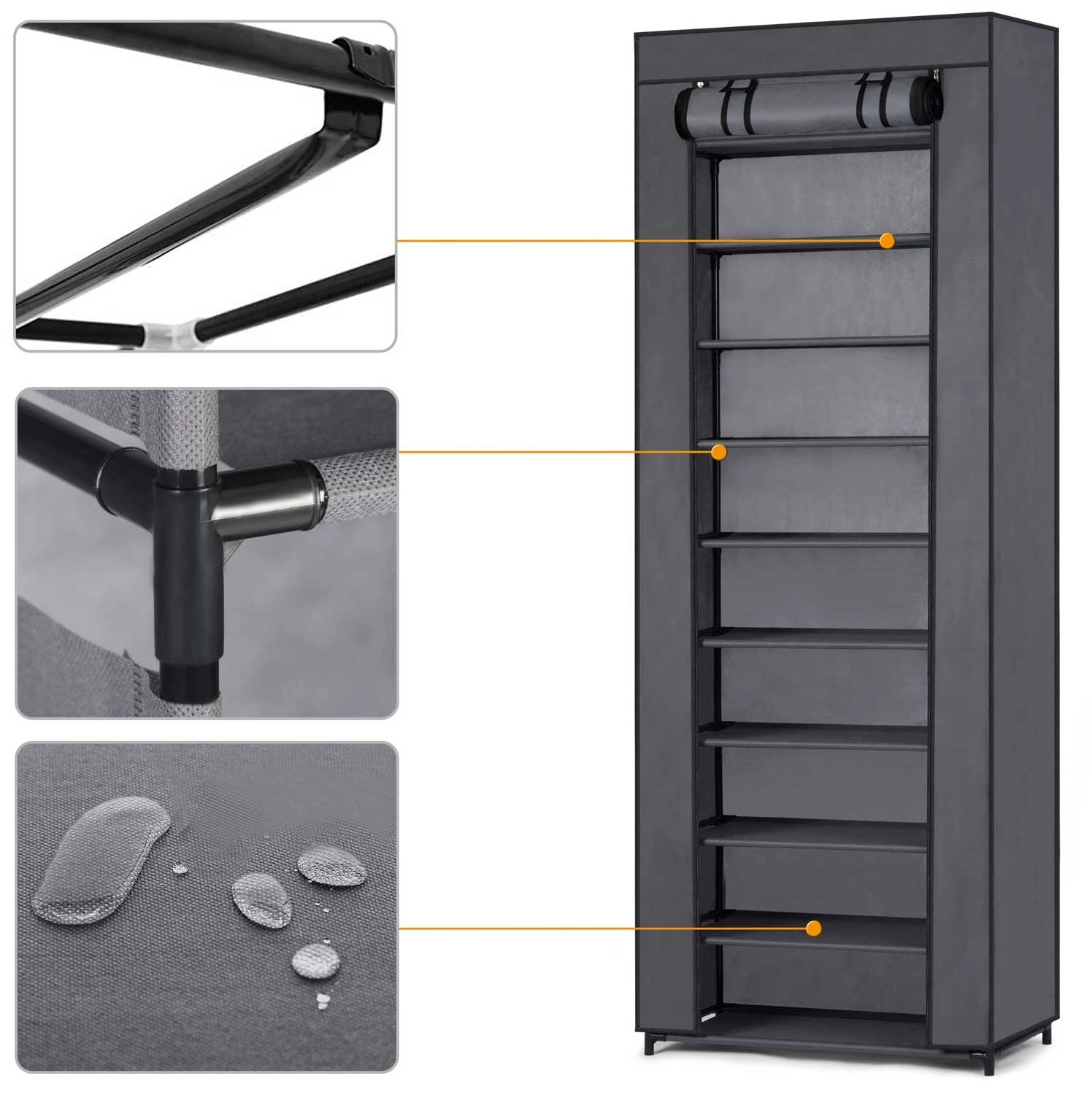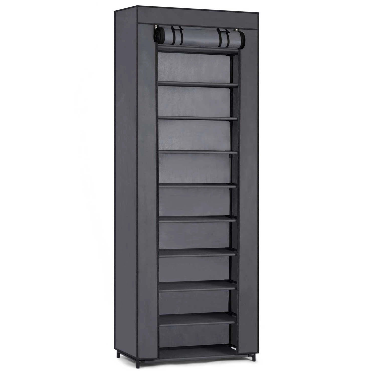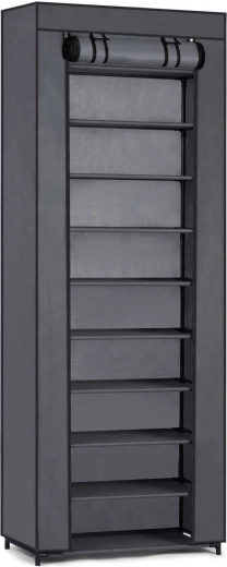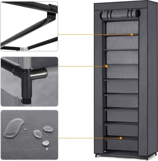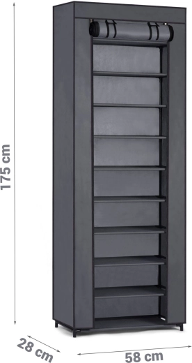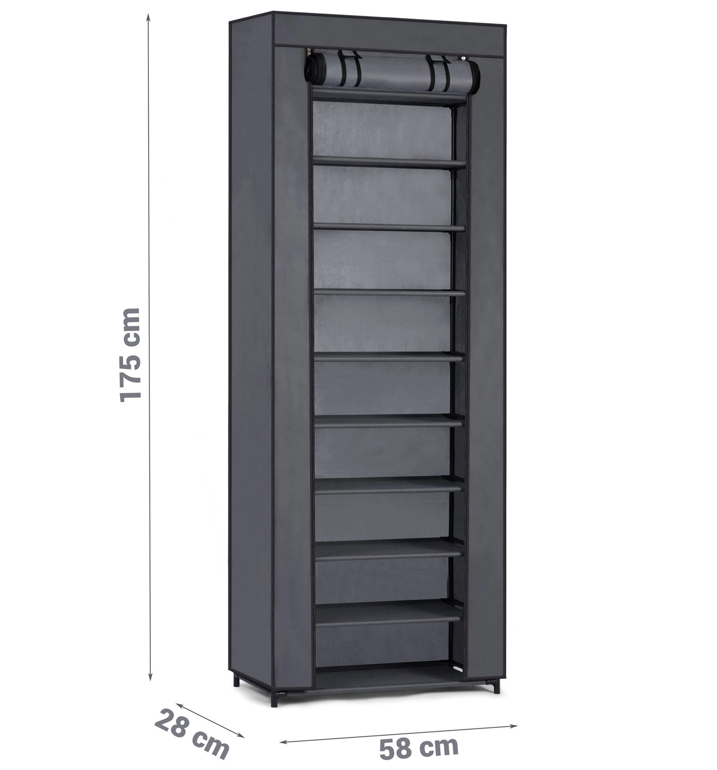 Praktický a odolný textilný botník Massido v grafitovej farbe ponúka 10 pevných políc, stabilnú oceľovú konštrukciu a zatváranie na zips. Vďaka jednoduchej a rýchlej montáži sa hodí do predsiene, šatne aj komory a udrží vašu obuv prehľadne usporiadanú a chránenú pred prachom.