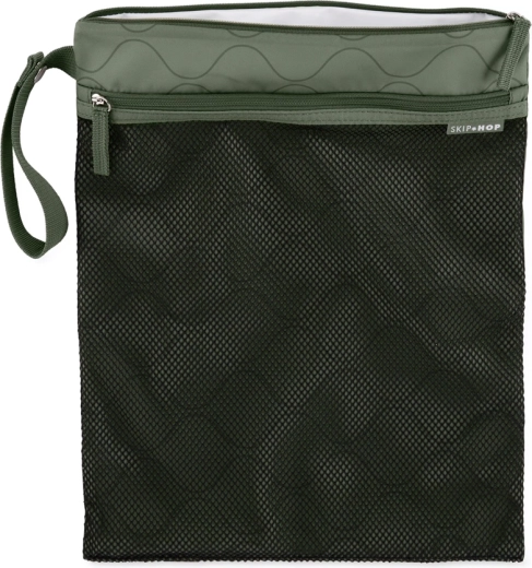 Už žiadne premočené tašky ani neporiadok. Vodeodolné vrecko SKIP HOP Grab & Go v odtieni Dark Sage ponúka dve oddelené zipsové časti pre mokré a suché veci. Predná sieťovaná časť zabezpečuje cirkuláciu vzduchu a prehľad o obsahu, zatiaľ čo horná komora bezpečne uloží mokré či špinavé predmety.