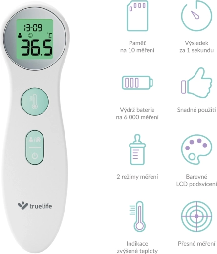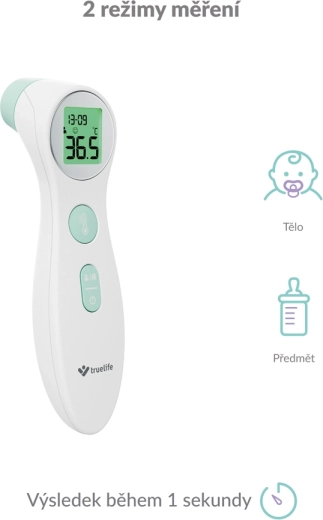 Rýchlo, hygienicky a bez dotyku. Bezkontaktný infračervený teplomer TRUELIFE Care Q6 zmeria teplotu do 1 sekundy s presnosťou ±0,1 °C. Ponúka 2 režimy merania – pre telo aj pre predmety a tekutiny, prehľadný LCD displej s farebným podsvietením a indikáciu horúčky. Pamätá si 10 posledných meraní a na jedny batérie zvládne až 6 000 meraní.