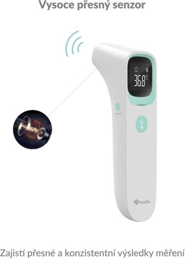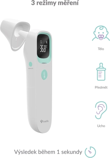 TRUELIFE Care Q9 je moderný bezkontaktný infračervený teplomer, ktorý zmeria teplotu do 1 sekundy s vysokou presnosťou. Vďaka trom režimom zvládne telesnú teplotu z čela aj ucha, rovnako ako teplotu predmetov a tekutín – ideálne na dojčenské mlieko, kúpeľ či nápoje. Farebný indikátor na displeji okamžite upozorní na zvýšenú teplotu, a to aj v tme.