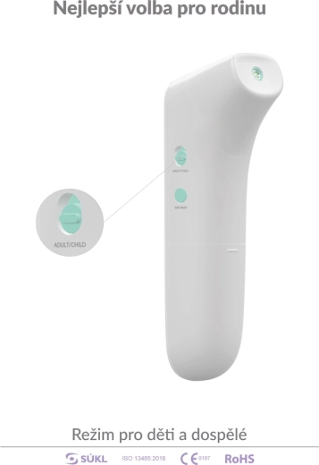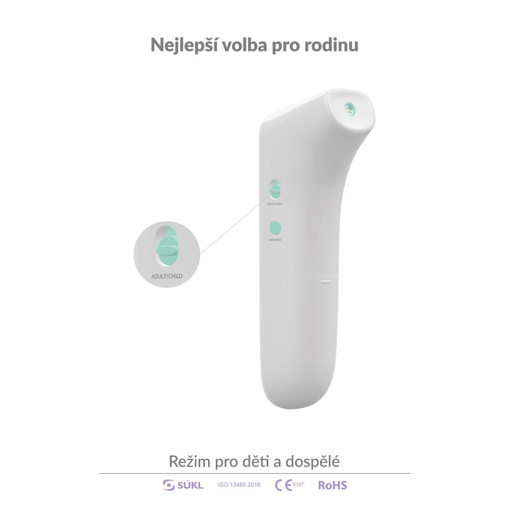 Pre rodiny s deťmi nechýba detský režim pre osoby mladšie ako 12 rokov. Meranie je úplne hygienické a pohodlné – stačí namieriť zo vzdialenosti 1–3 cm a stlačiť jediné tlačidlo. Teplomer si pamätá 20 posledných hodnôt a vďaka úspornému režimu zvládne až 20 000 meraní na jedny batérie.