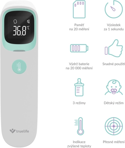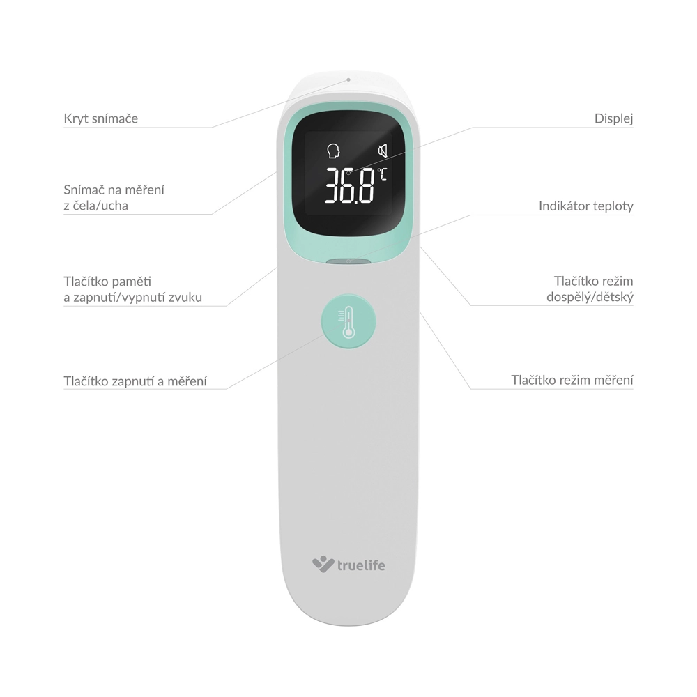 Rýchle a hygienické meranie bez dotyku počas jednej sekundy. TRUELIFE Care Q9 ponúka 3 režimy (čelo, ucho, predmety/tekutiny), presnosť ±0,1 °C, farebný indikátor horúčky, pamäť 20 meraní a výdrž až 20 000 meraní. Jednoduché ovládanie jediným tlačidlom a prehľadný podsvietený LCD displej oceníte doma aj na cestách.