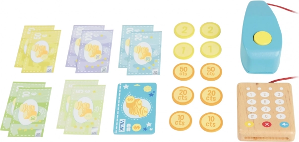Súčasťou setu sú aj papierové bankovky a drevené mince, ktoré podporujú rozvoj jemnej motoriky a základných matematických zručností. Kvalitné drevené prevedenie zaisťuje dlhú životnosť a bezpečnú hru.
