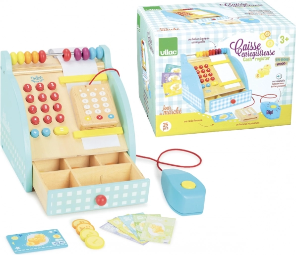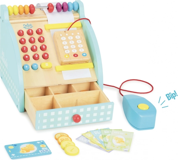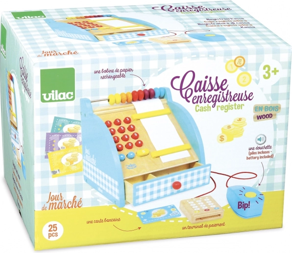 Štýlová drevená pokladňa VILAC poteší malých predavačov aj predavačky. Ponúka funkčnú numerickú klávesnicu, zásuvku na peniaze, počítadlo a bankový terminál. Súčasťou sú aj bankovky a mince i klasické zvukové tlačidlo, ktoré dodá hre na autentickosti.