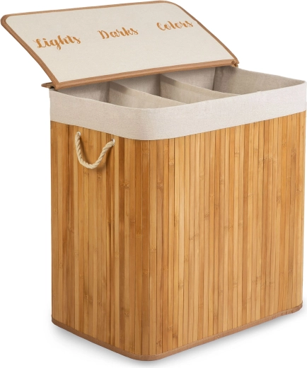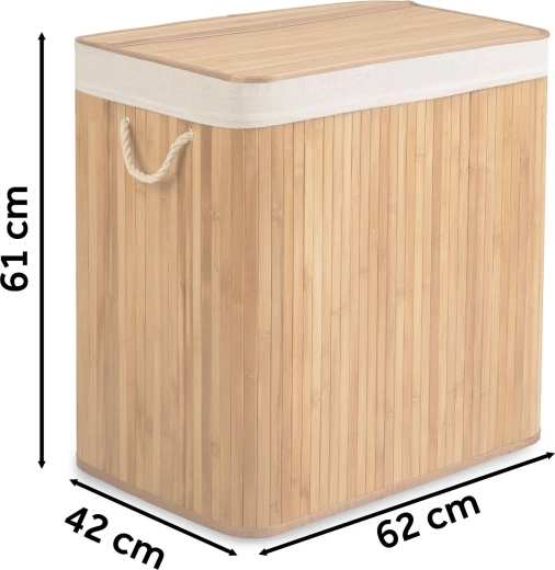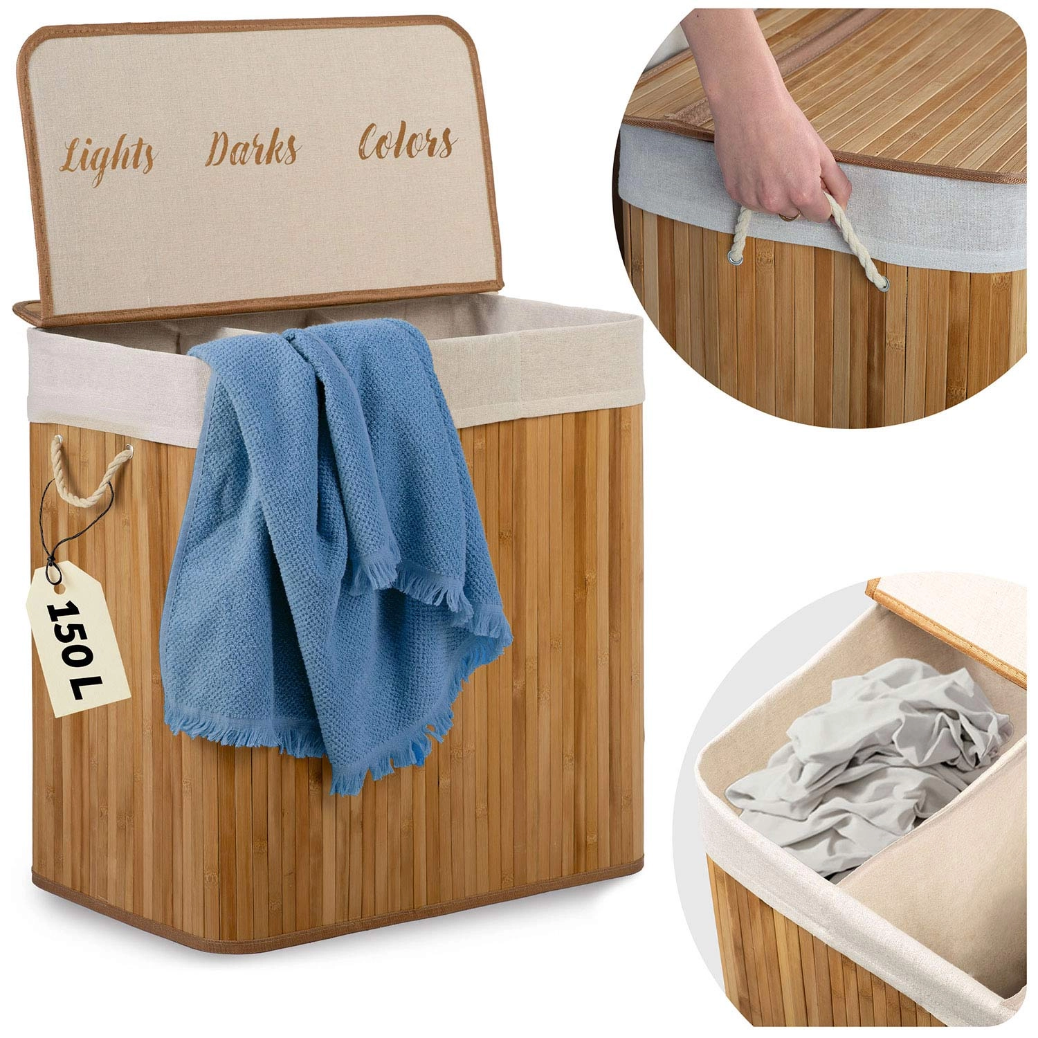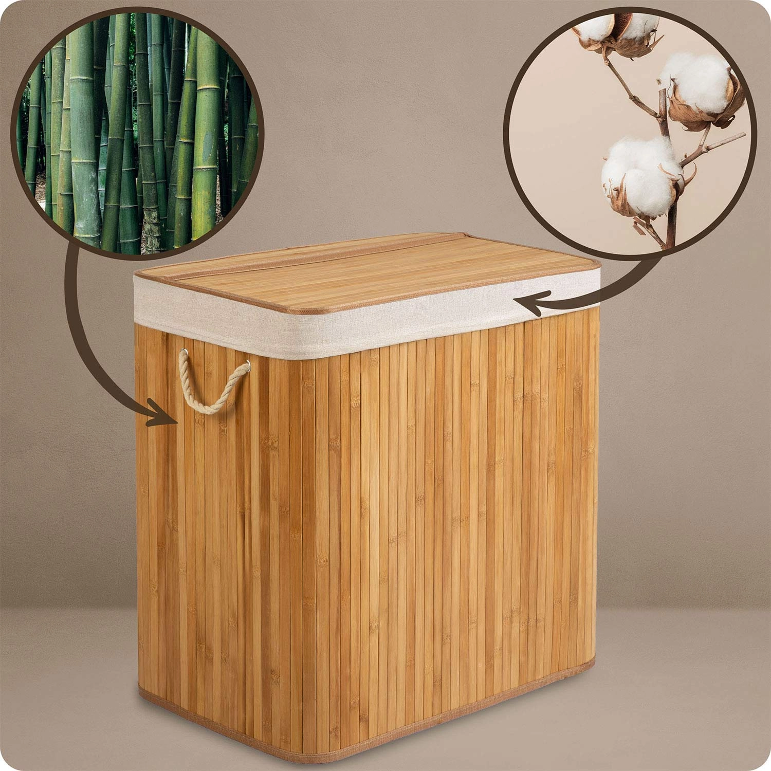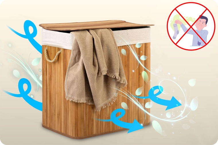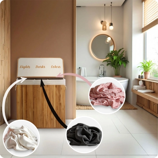 Prírodný bambus a priedušná bavlna podporujú cirkuláciu vzduchu a pomáhajú obmedziť vlhkosť aj neželané pachy. Premyslené detaily ako pevné lanové ušká, odnímateľné veko, vyberateľné vrecko s možnosťou zaviazania a stabilné plné dno robia z koša odolného každodenného pomocníka.