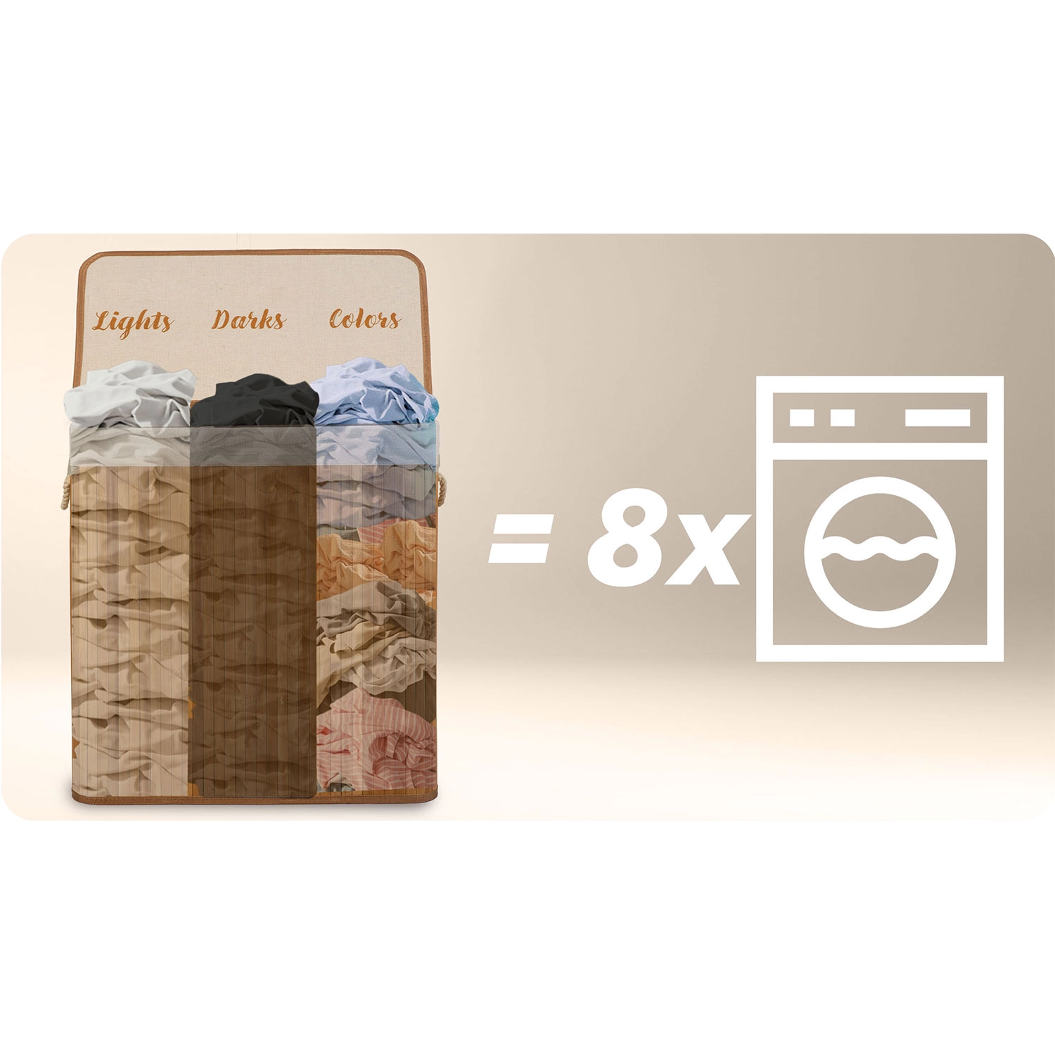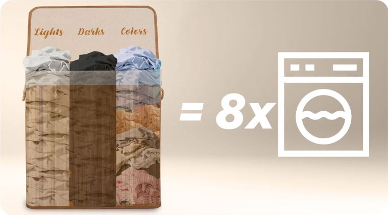 Maximálna praktickosť a prehľadné triedenie bielizne v jednom. Kôš ponúka kapacitu 150 litrov – pojme až obsah niekoľkých praní – a tri jasne oddelené sekcie s praktickým označením vo vnútri veka: Lights, Darks, Colors. Vďaka tomu šetríte čas aj nervy tesne pred praním.