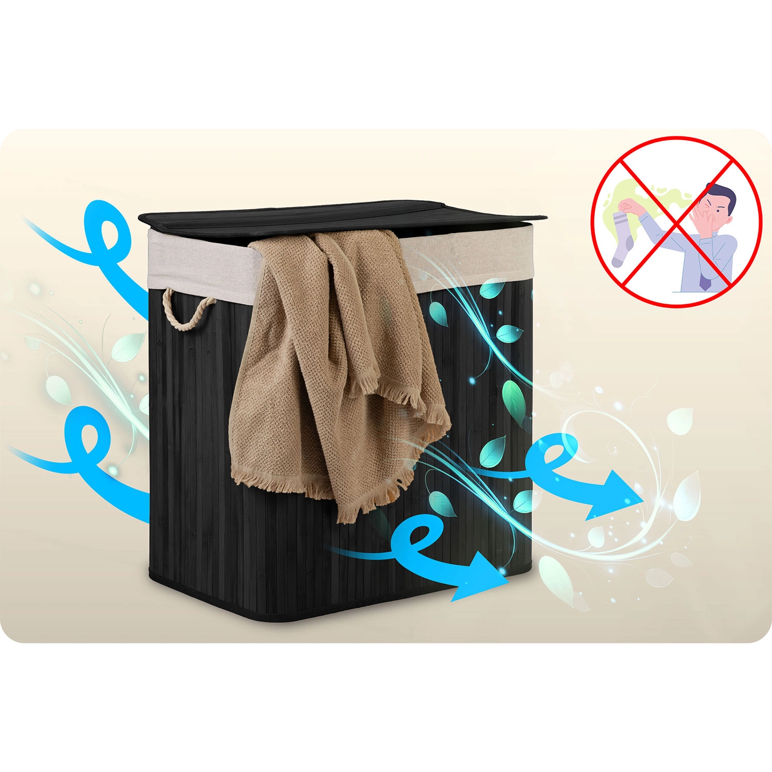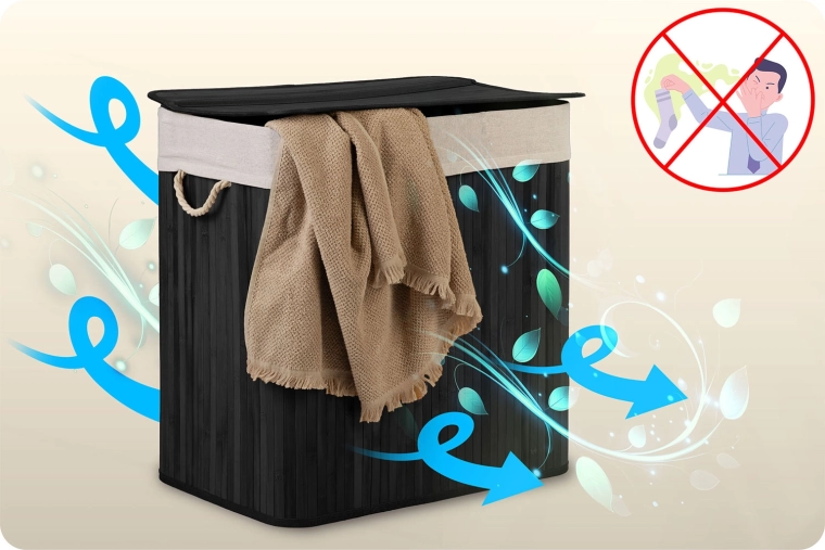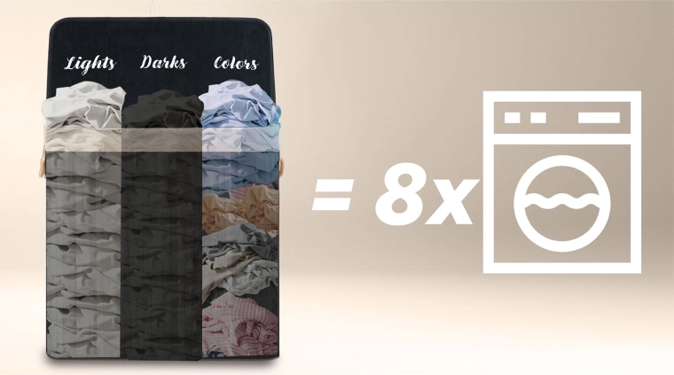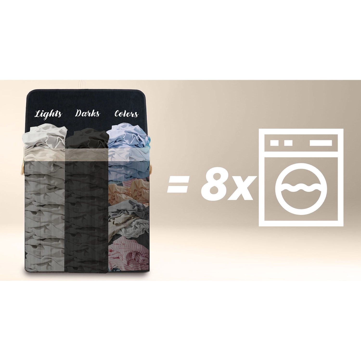 Objavte praktické riešenie na každodenné triedenie prádla. Veľkorysý objem 150 litrov pojme prádlo až z niekoľkých pračiek, zatiaľ čo prehľadné označenie Lights / Darks / Colors vás zbaví zdĺhavého triedenia pred praním. Prírodné materiály – bambus a bavlna – podporujú cirkuláciu vzduchu a obmedzujú pachy.