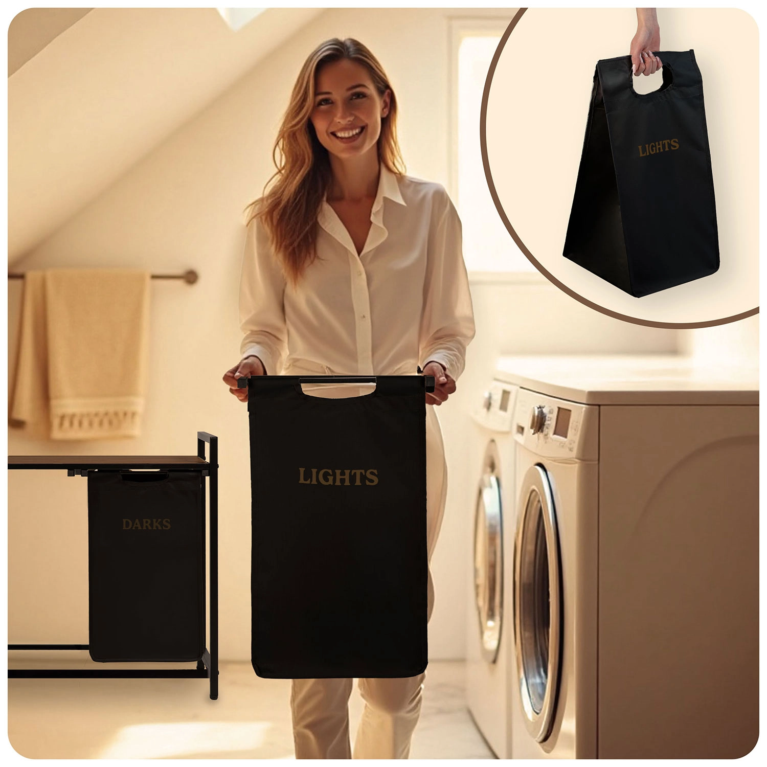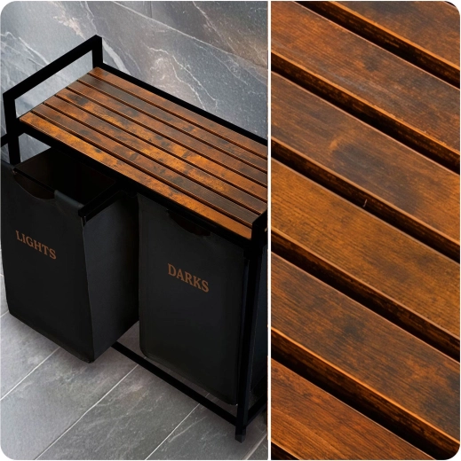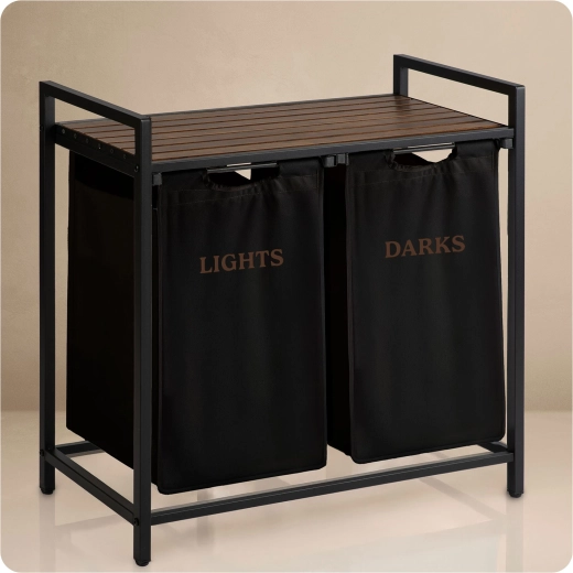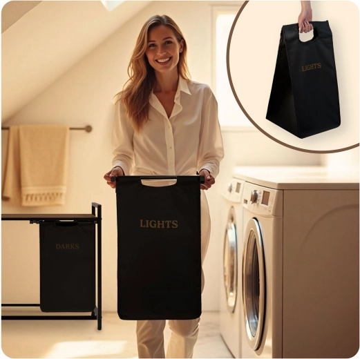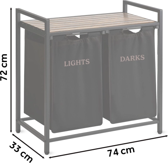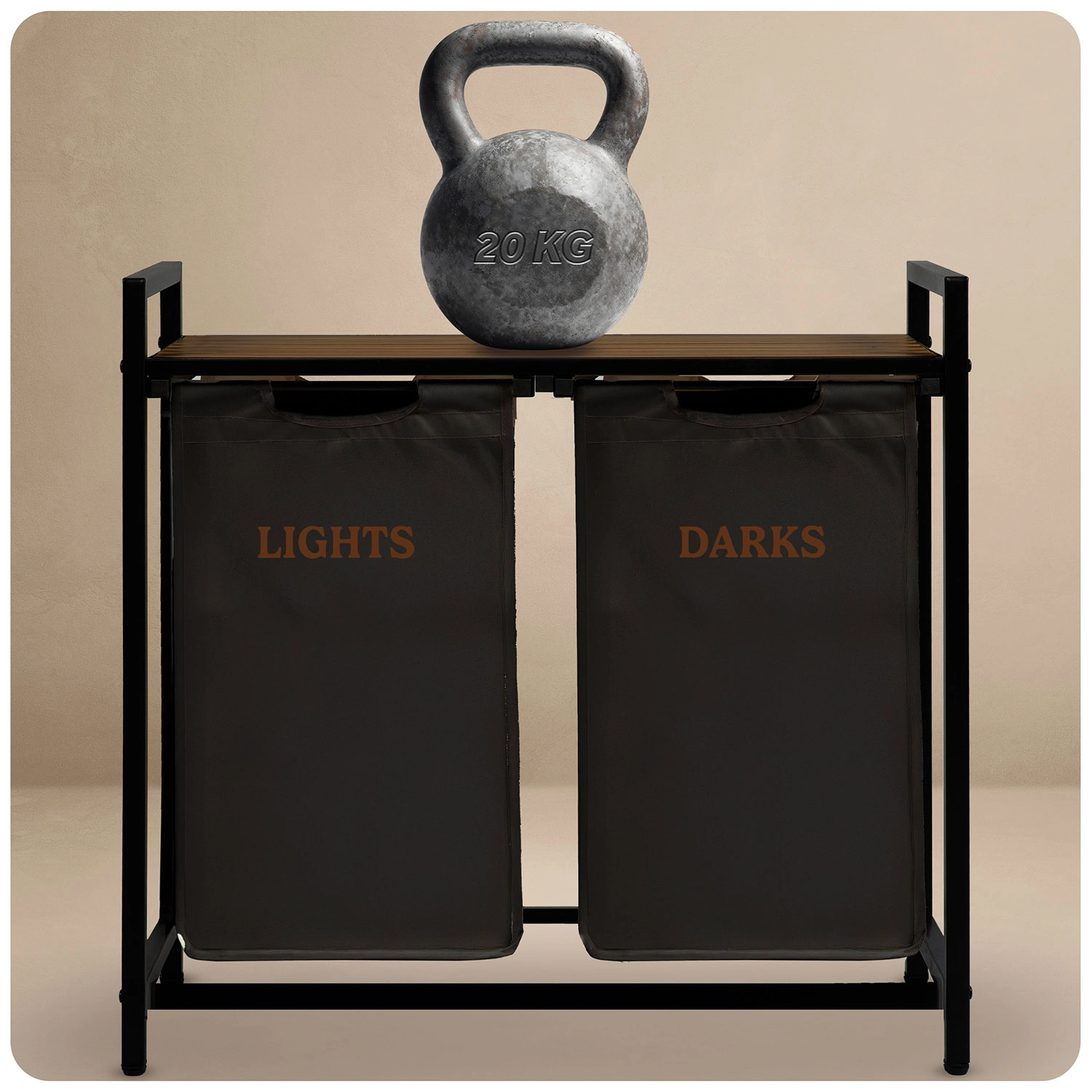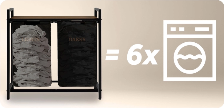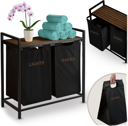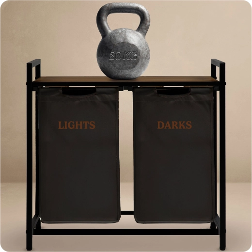 Vďaka dvom samostatným textilným košom označeným „Lights“ a „Darks“ triedite prádlo hneď pri odkladaní – žiadne zdĺhavé delenie pred praním. Horná polica z prírodného dreva ponúka priestor pre pracie prostriedky, koše s uterákmi či drobné spotrebiče a unesie až 20 kg.