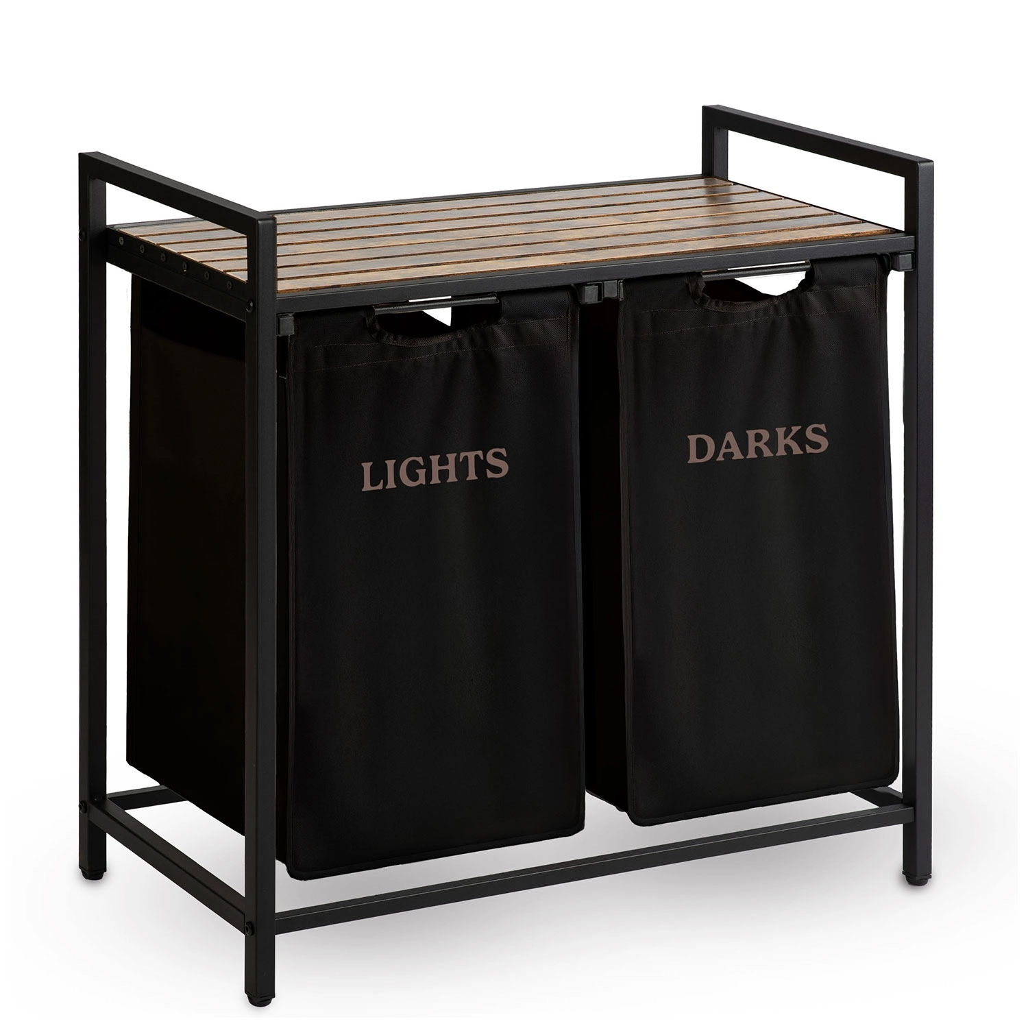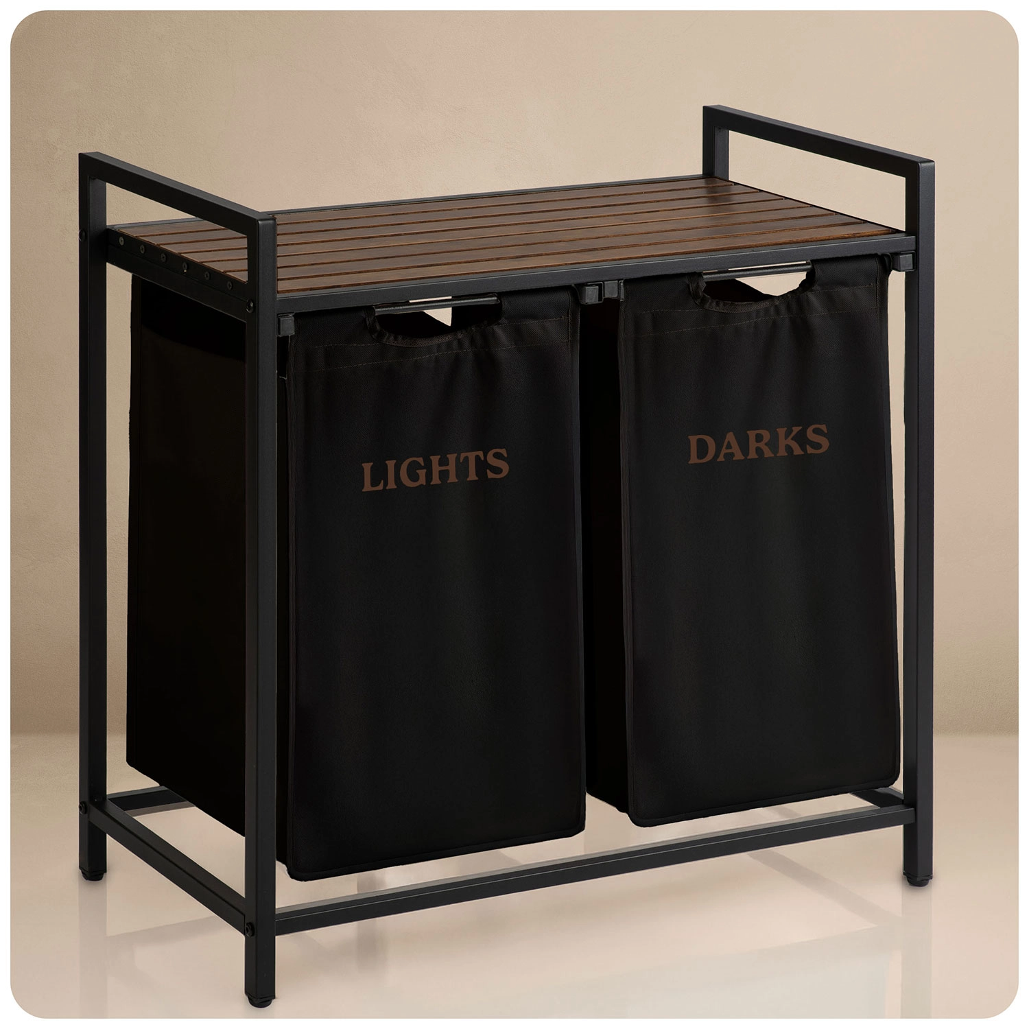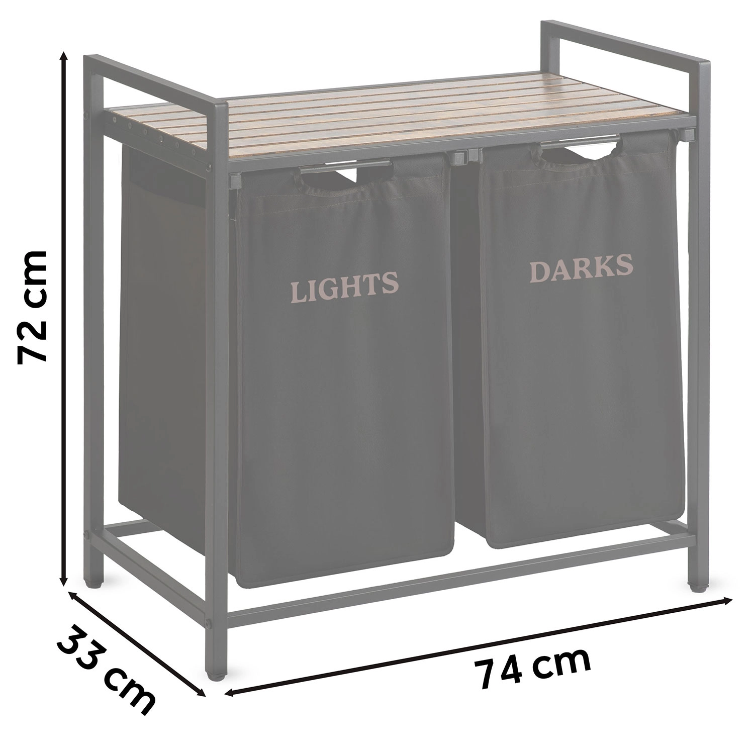 Vďaka dvom samostatným textilným košom označeným „Lights“ a „Darks“ triedite prádlo hneď pri odkladaní – žiadne zdĺhavé delenie pred praním. Horná polica z prírodného dreva ponúka priestor pre pracie prostriedky, koše s uterákmi či drobné spotrebiče a unesie až 20 kg.