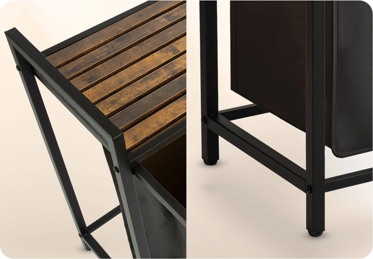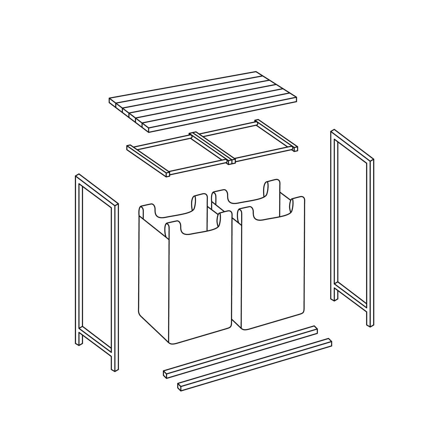 Rám z práškovo lakovanej ocele je odolný proti korózii, poškrabaniu a oderu, drevená doska je odolná voči vlhkosti a plesniam. Vyberateľné vložky s praktickými ušami premenia kôš na prenosné vrece – jednoducho vyberiete a prenesiete k práčke bez neporiadku.