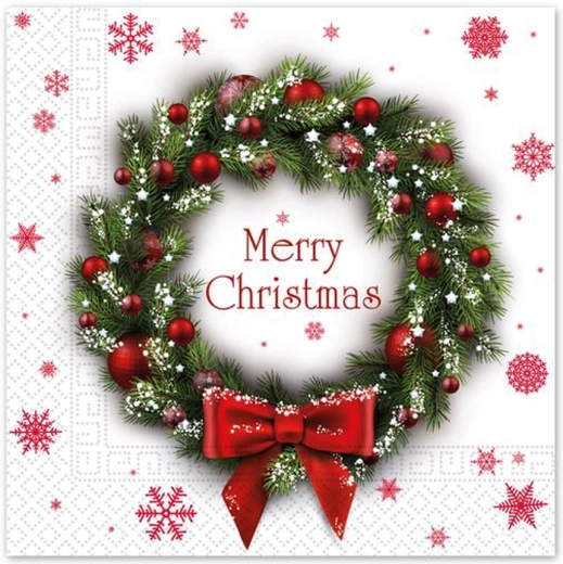 Štýlové vianočné papierové servítky s motívom venca dodajú sviatočnému stolu ten pravý šmrnc. Sú 3-vrstvové, príjemne mäkké a pevné, v univerzálnom formáte 33 × 33 cm a v balení po 20 kusoch – ideálne na rodinné oslavy aj sviatočné pohostenie.