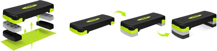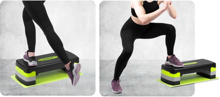 Step je skvelý na spaľovanie kalórií, tvarovanie dolných končatín a zadku, ale aj na posilnenie paží a trupu (dipy, kliky, plank). Vďaka kompaktným rozmerom a možnosti uložiť nadstavce pod telo stepu ho ľahko uskladníte aj v menšom byte. Bonusová protišmyková podložka zlepší priľnavosť a ochráni vašu podlahu.