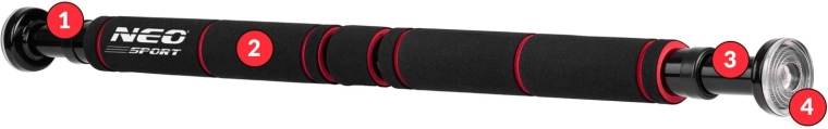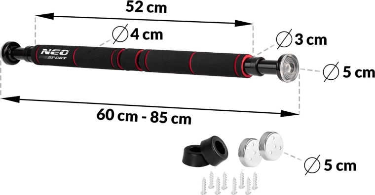 Premente bežný dverový otvor na domácu posilňovňu s rozpernou hrazdou NEO SPORT. Vďaka nastaviteľnej dĺžke 60–85 cm, pevnej oceľovej konštrukcii a pohodlným protišmykovým penovým úchopom je tréning chrbta, paží a ramien bezpečný a komfortný. Gumové koncovky chránia zárubne a zvyšujú istotu montáže, priložené bezpečnostné držiaky zvyšujú stabilitu pri náročnejších cvikoch.