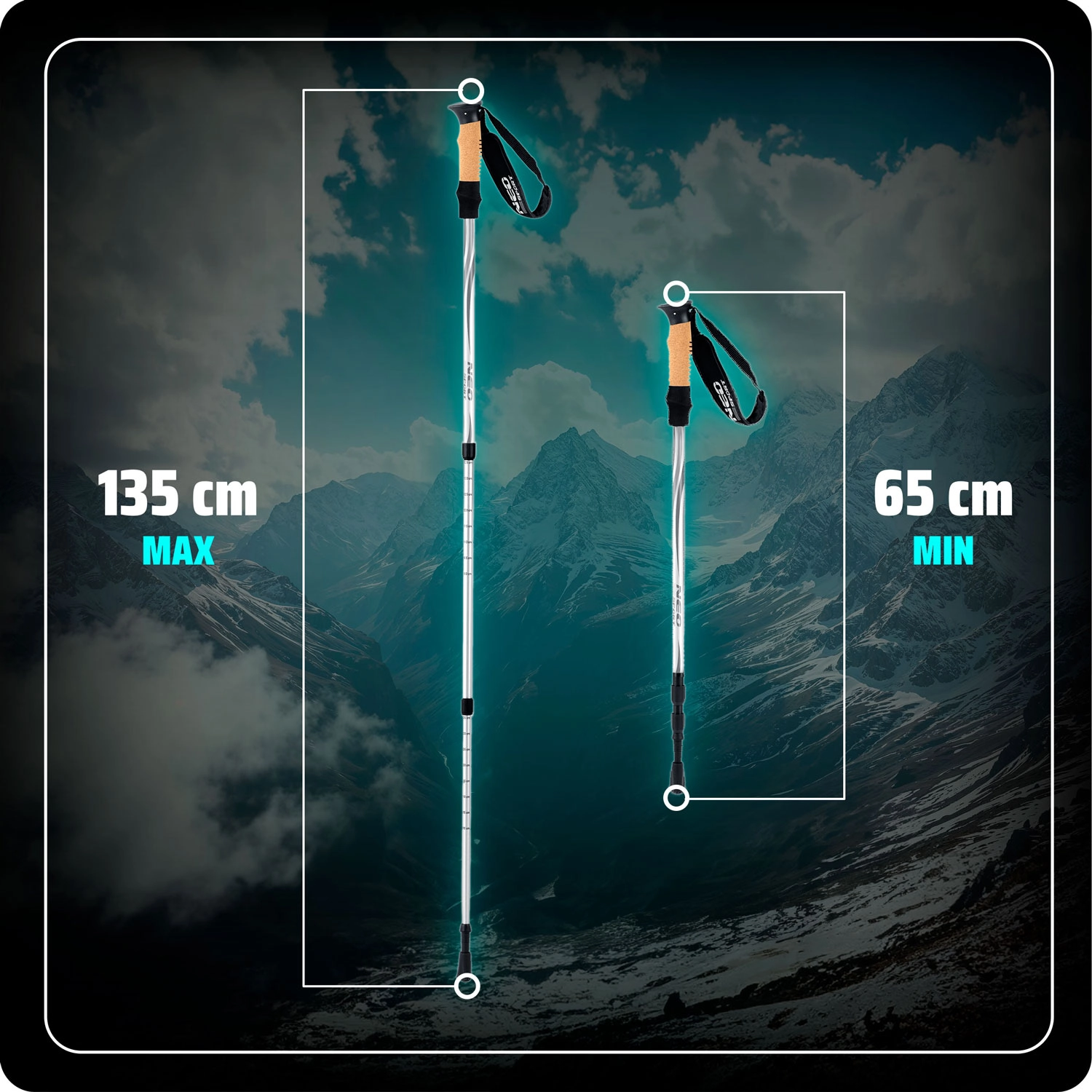 Viacdielne hliníkové trubky s mierkou umožňujú rýchle a presné nastavenie pre rôzne výšky aj sklony svahu. Kompaktné po zložení – ľahko ich pripevníte na batoh.