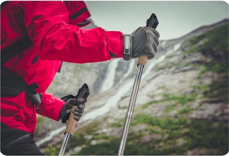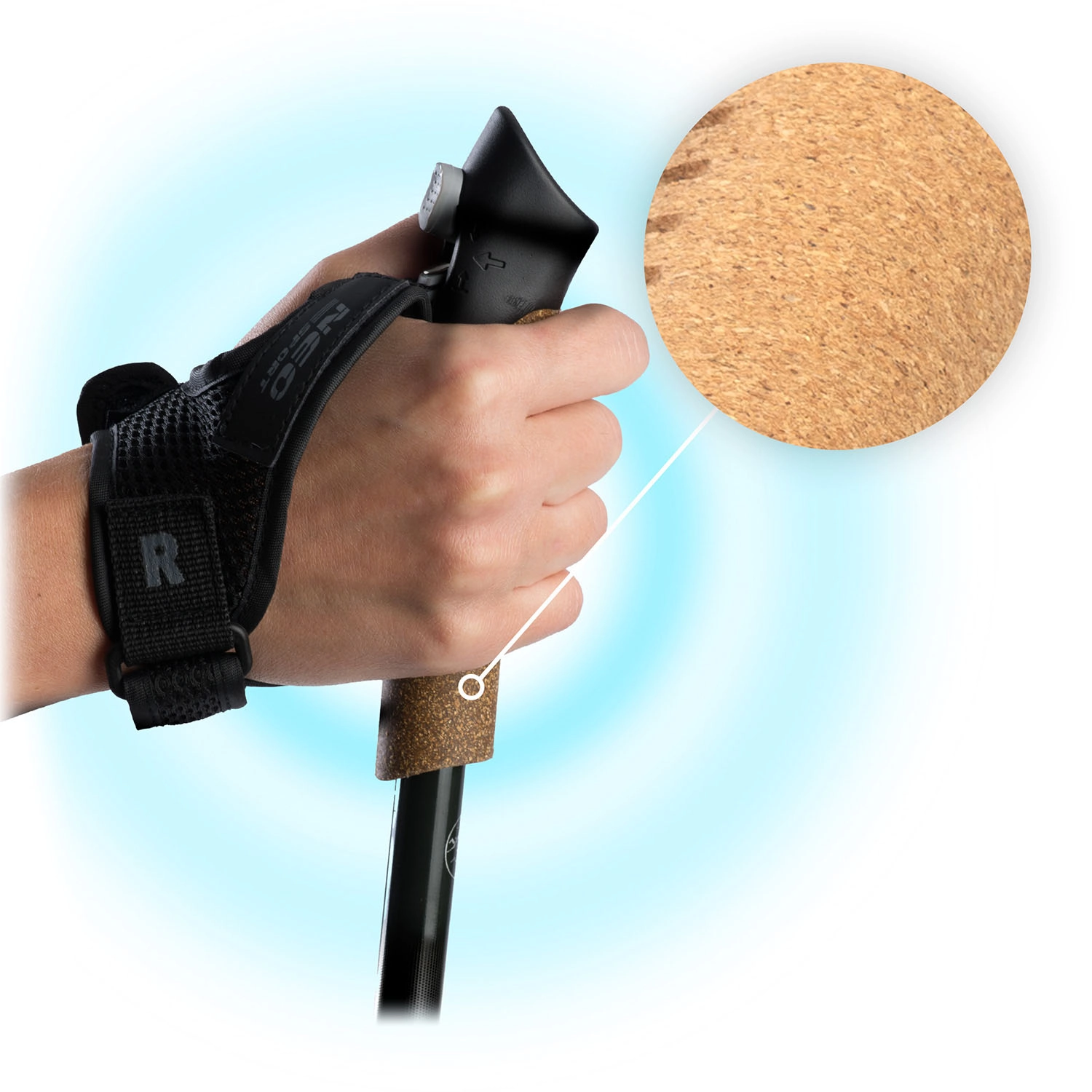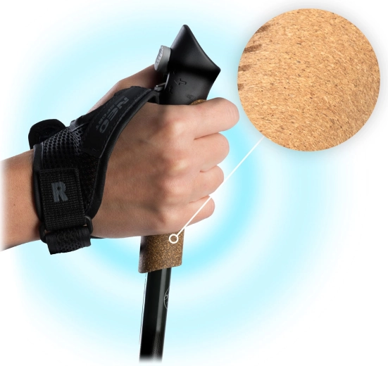 Priedušný korok udrží dlane v suchu a pohodlí. Nastaviteľné rukavičky sa ľahko odopínajú jedným tlačidlom – pevný úchop bez únavy prstov aj pri dlhých túrach.