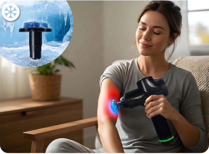- Chladiaca gélová hlavica: po predchádzajúcom schladení upokojuje podráždenie, zmierňuje opuchy a zápaly – ideálna po preťažení či intenzívnom výkone.