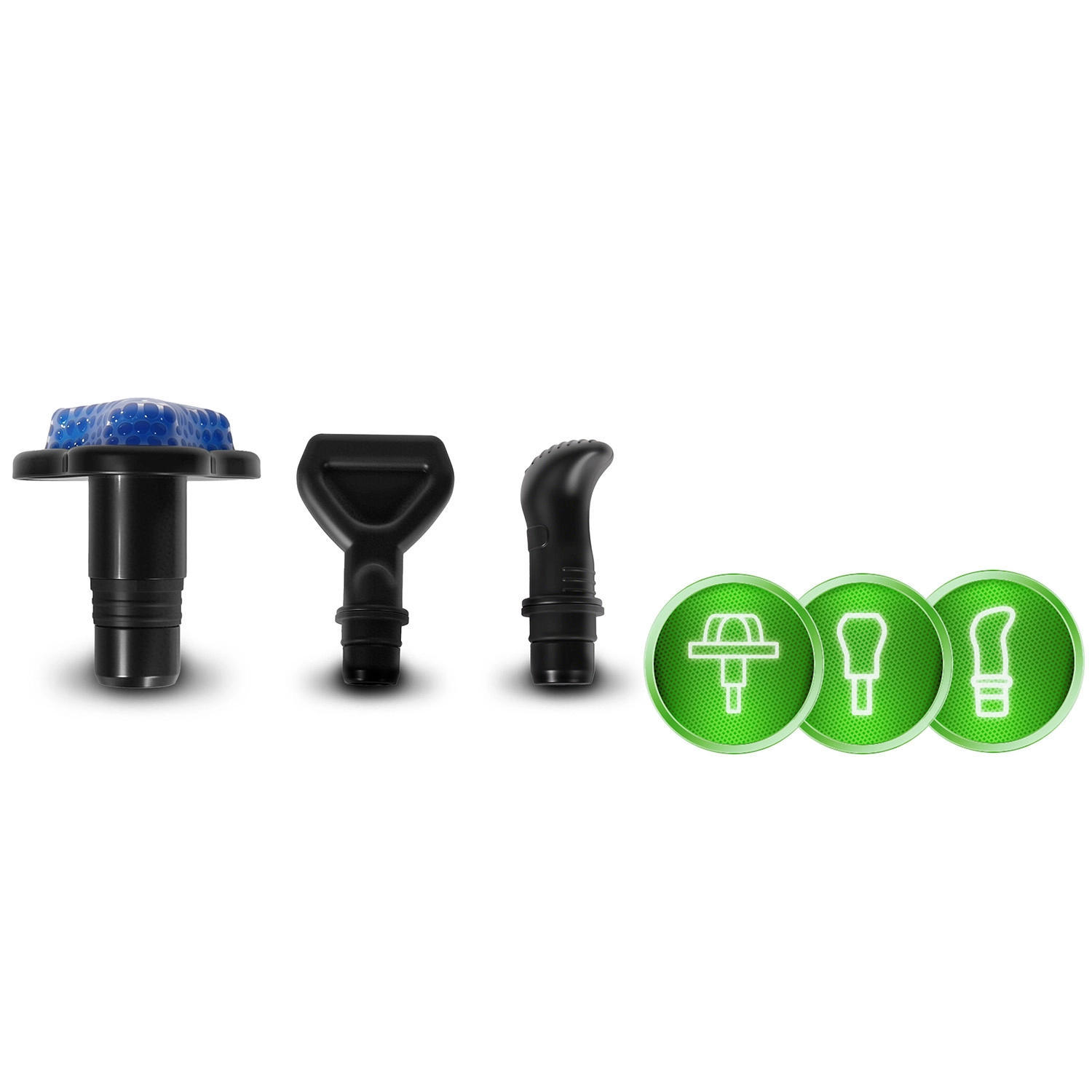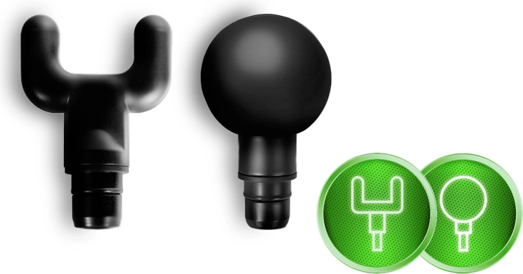 U‑hlava na oblasť okolo chrbtice, guľová na väčšie svalové skupiny, plochá na všestrannú relaxáciu, hrot na intenzívnu bodovú masáž, chladiaca gélová, lopatková na masáž pozdĺž kostných štruktúr, prstová na presný tlak, dvojitá hubičková na prekrvenie a mäkká hubičková na citlivé partie.