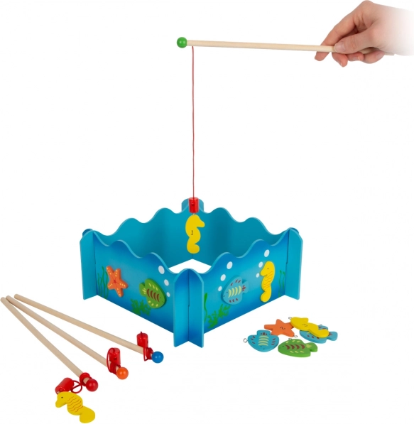 Deti lovia farebné rybky a morské koníky pomocou drevených prútov s magnetom. Jednoduchý princíp, veľká porcia zábavy a tréning jemnej motoriky.