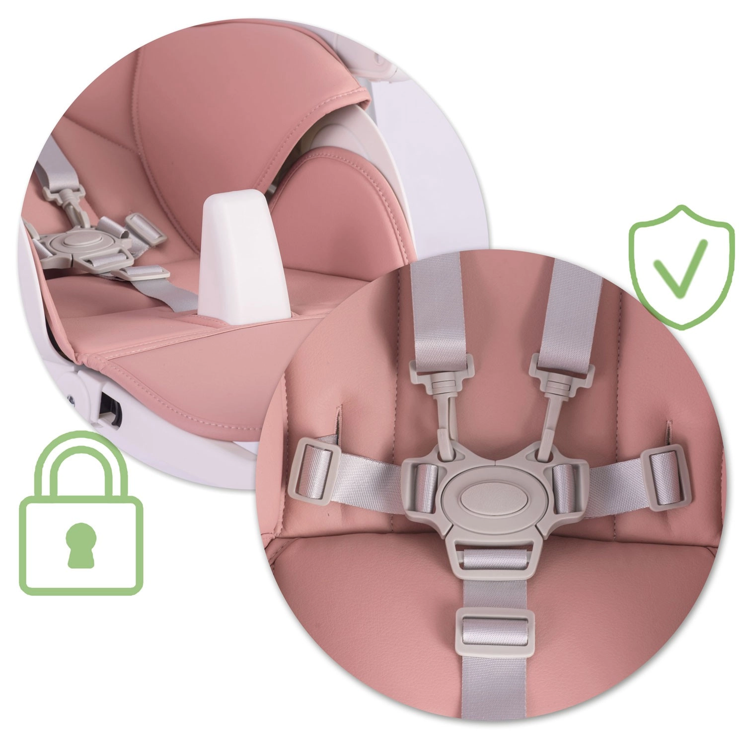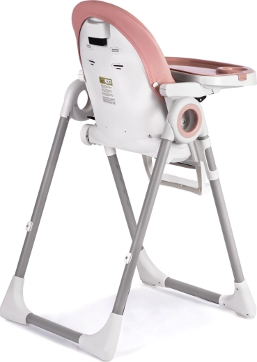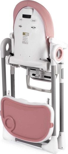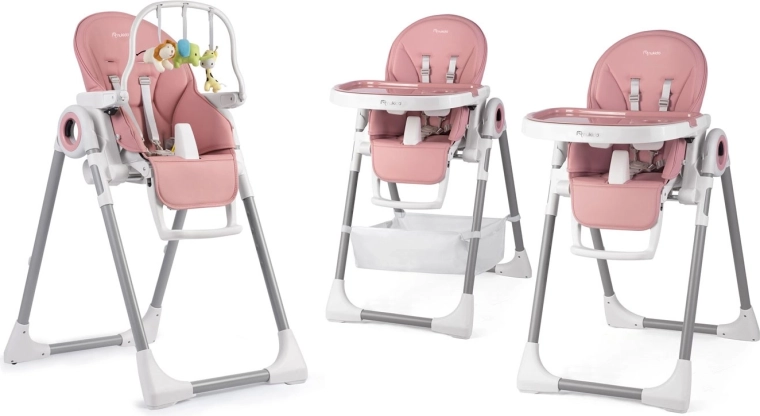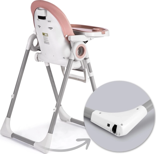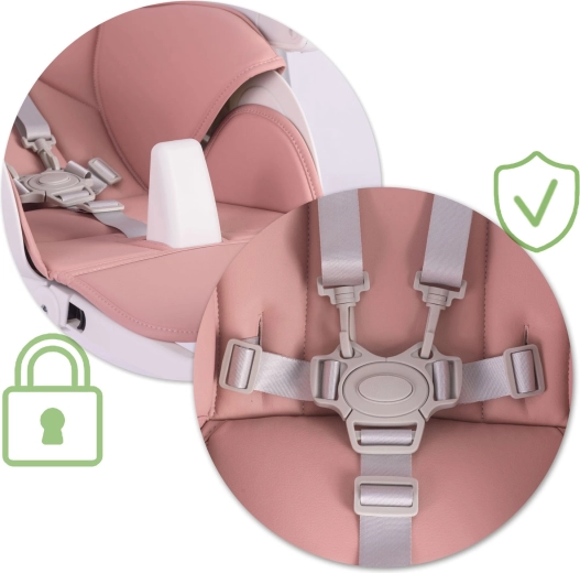 Bezpečnosť zabezpečujú 5-bodové bezpečnostné pásy a stabilný kovový rám s protišmykovými koncovkami. Zadné kolieska umožňujú jednoduché presúvanie po byte, zatiaľ čo kompaktný skladací mechanizmus šetrí priestor pri ukladaní. Poťahy z odolného, na údržbu nenáročného materiálu stačí po jedle jednoducho utrieť.