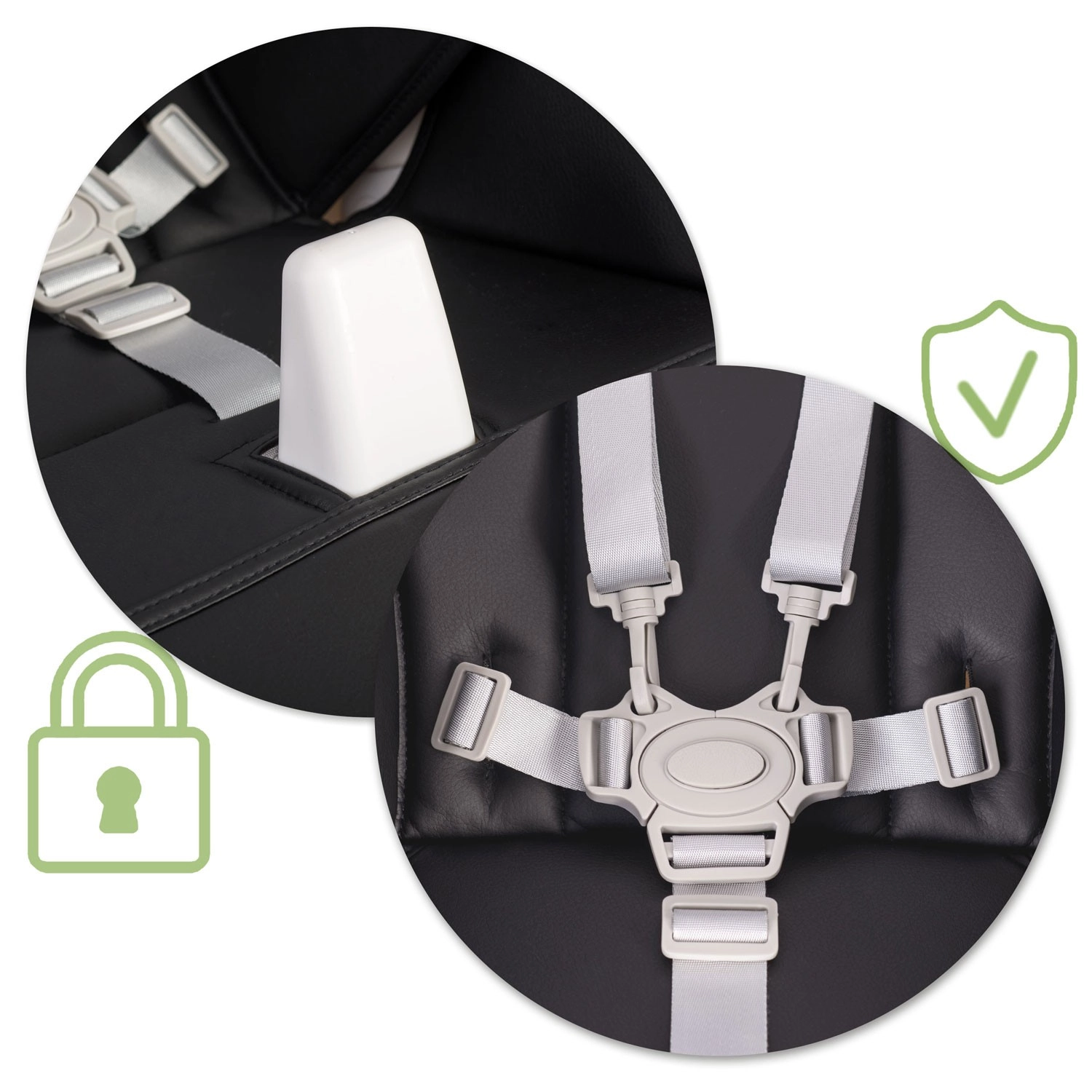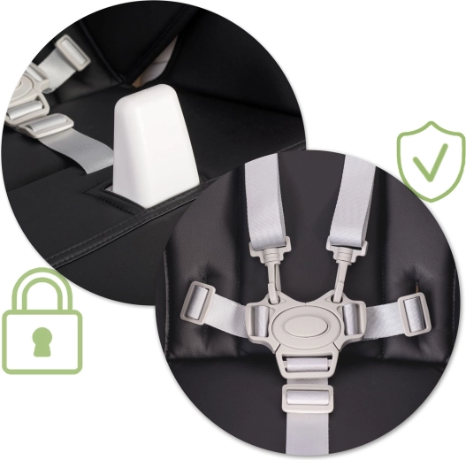 Nastaviteľné 5bodové pásy a stredový rozkrokový popruh pevne držia dieťa v bezpečnej polohe a bránia samovoľnému vysunutiu zo stoličky.