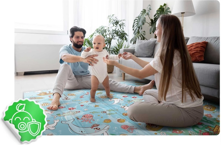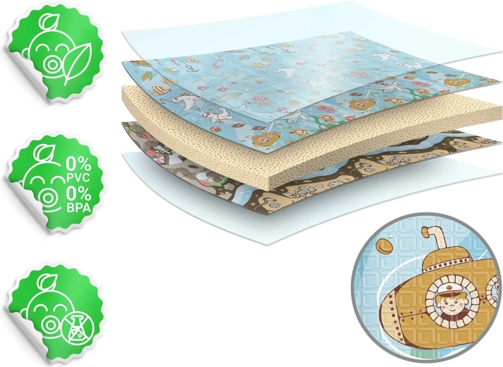 Podložka je skladacia harmonikovito, ľahká a prenosná – ľahko ju vezmete na piknik, do obývačky aj na záhradu. Vodoodolný povrch stačí utrieť vlhkou handričkou, protišmykové textúrovanie zabezpečuje stabilitu. Materiál neobsahuje škodliviny (BPA, PVC, ftaláty, formamid) a spĺňa prísne európske normy EN71-1/2/3 aj CE.