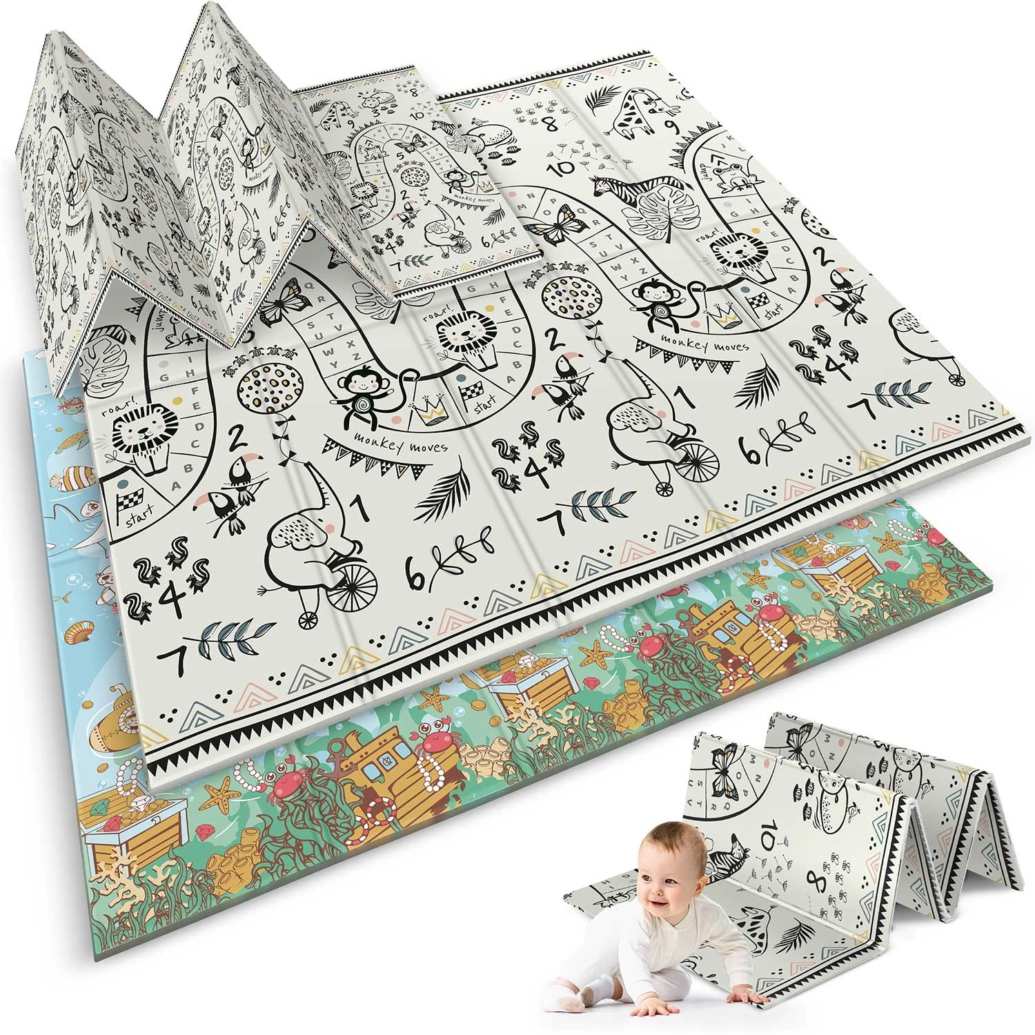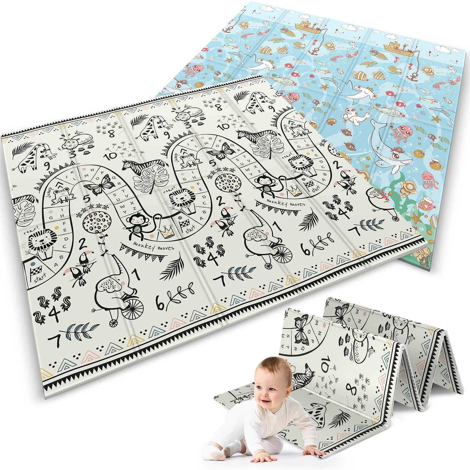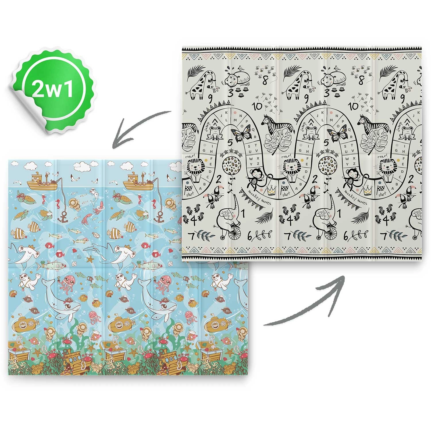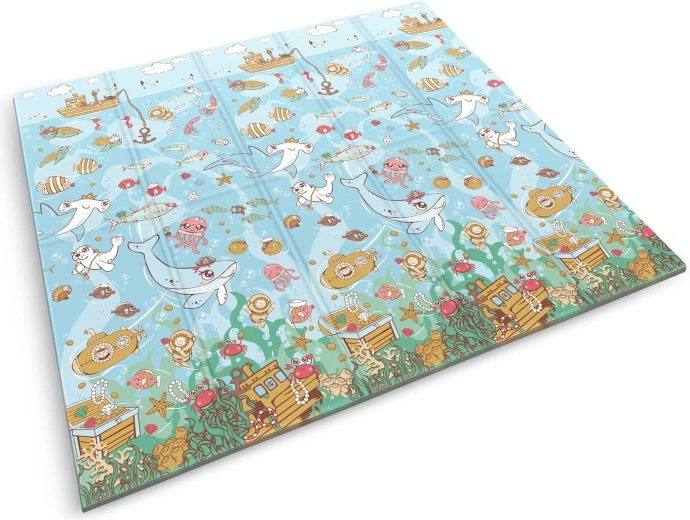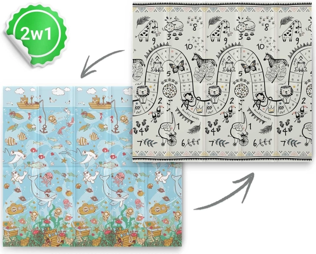 Jedna strana s podmorským svetom, druhá s čierno‑bielou hernou cestou a zvieratami. Podporuje učenie čísel, koordináciu a zmyslový rozvoj detí rôzneho veku.