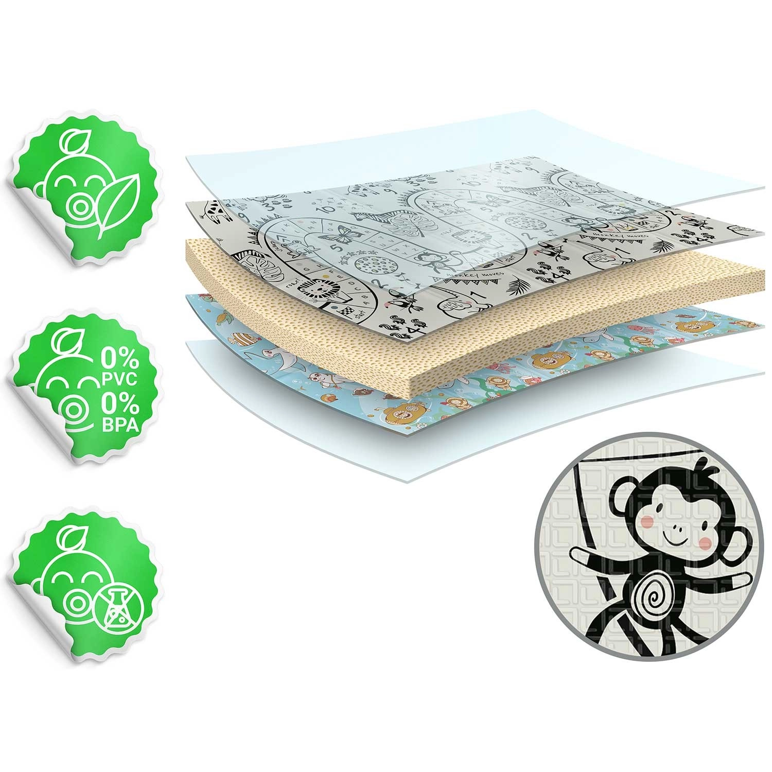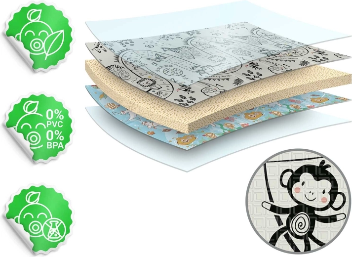 Hrúbka 1 cm výborne tlmí pády a izoluje od chladu. Materiál je bez zápachu a neobsahuje BPA, PVC, ftaláty ani formamid. Jednoduchá údržba – stačí utrieť.