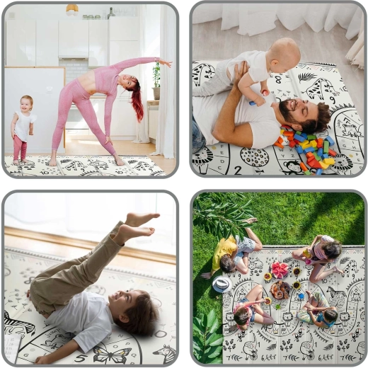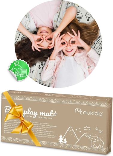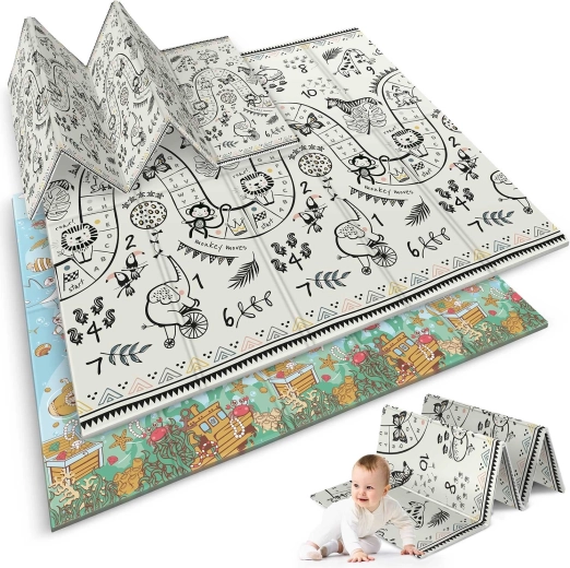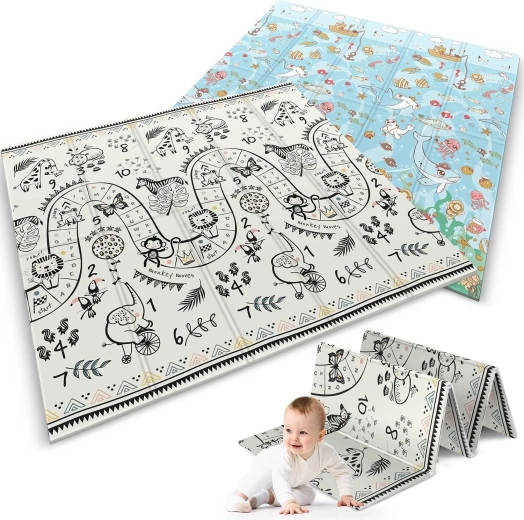 Veľká skladacia podložka NUKIDO s rozmermi 200 × 180 × 1 cm ponúka mäkké tlmenie pádov, tepelnú izoláciu od studenej podlahy a obojstranný dizajn oceán–safari pre zábavu aj učenie. Je vodoodolná, ľahko sa čistí, má protišmykovú úpravu a je vyrobená z bezpečnej peny XPE bez BPA, PVC, ftalátov a formamidu. Ideálna na hranie, lezenie, prvé krôčiky, cvičenie aj piknik.