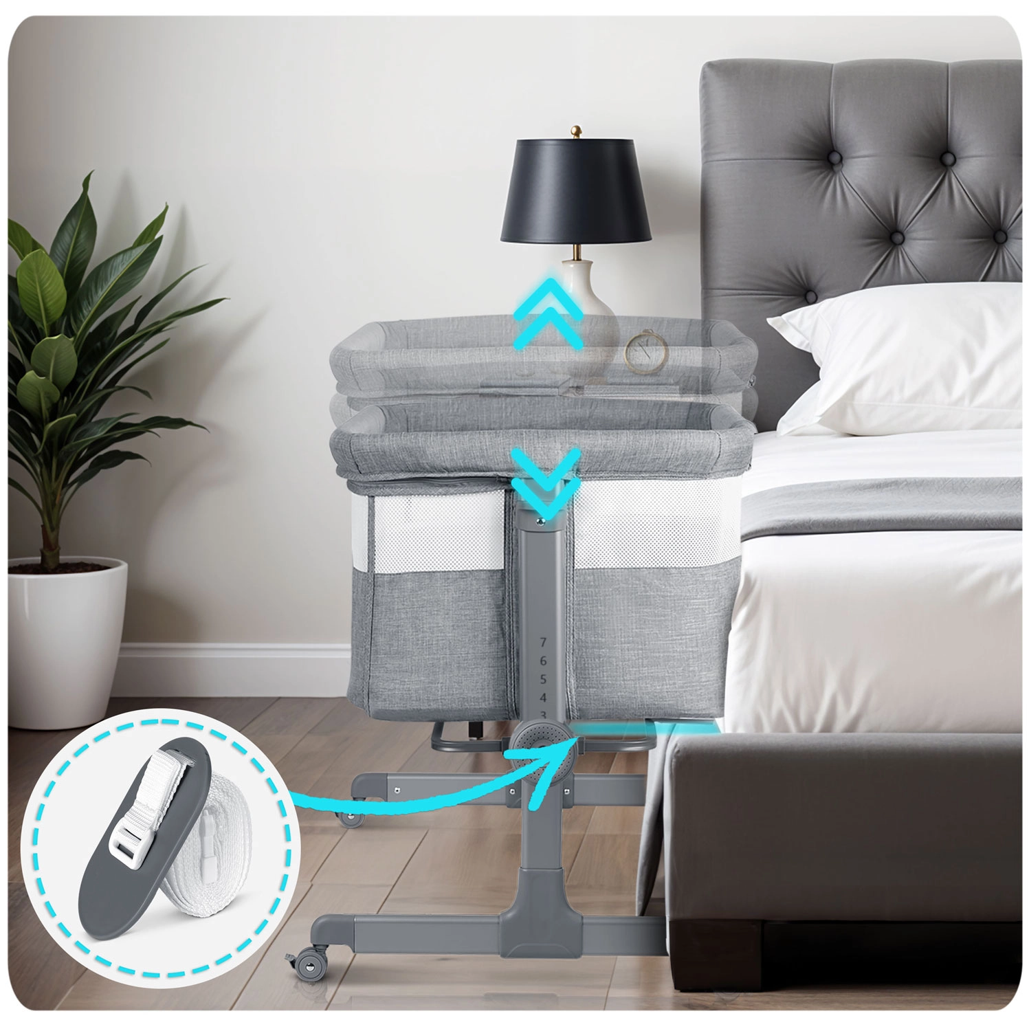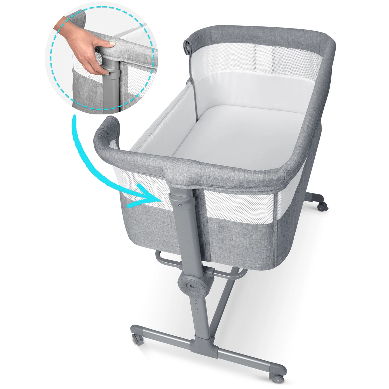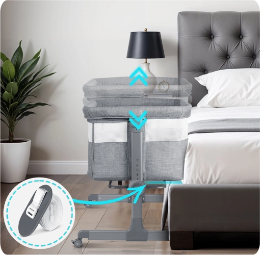 Ľahko nastavíte výšku každej strany zvlášť. Zarovnáte výšku k posteli rodičov alebo vytvoríte jemný sklon, užitočný napríklad pri refluxe.
