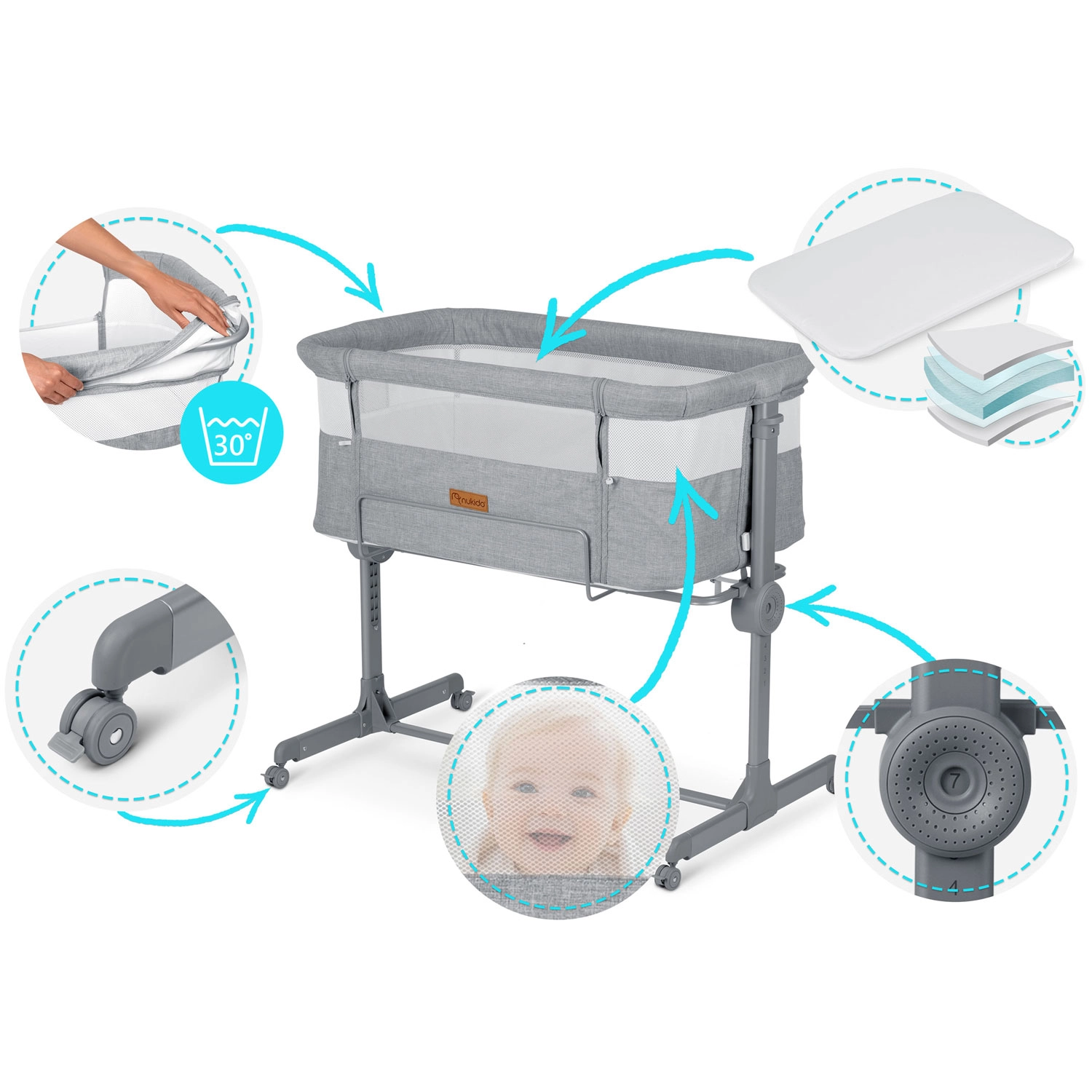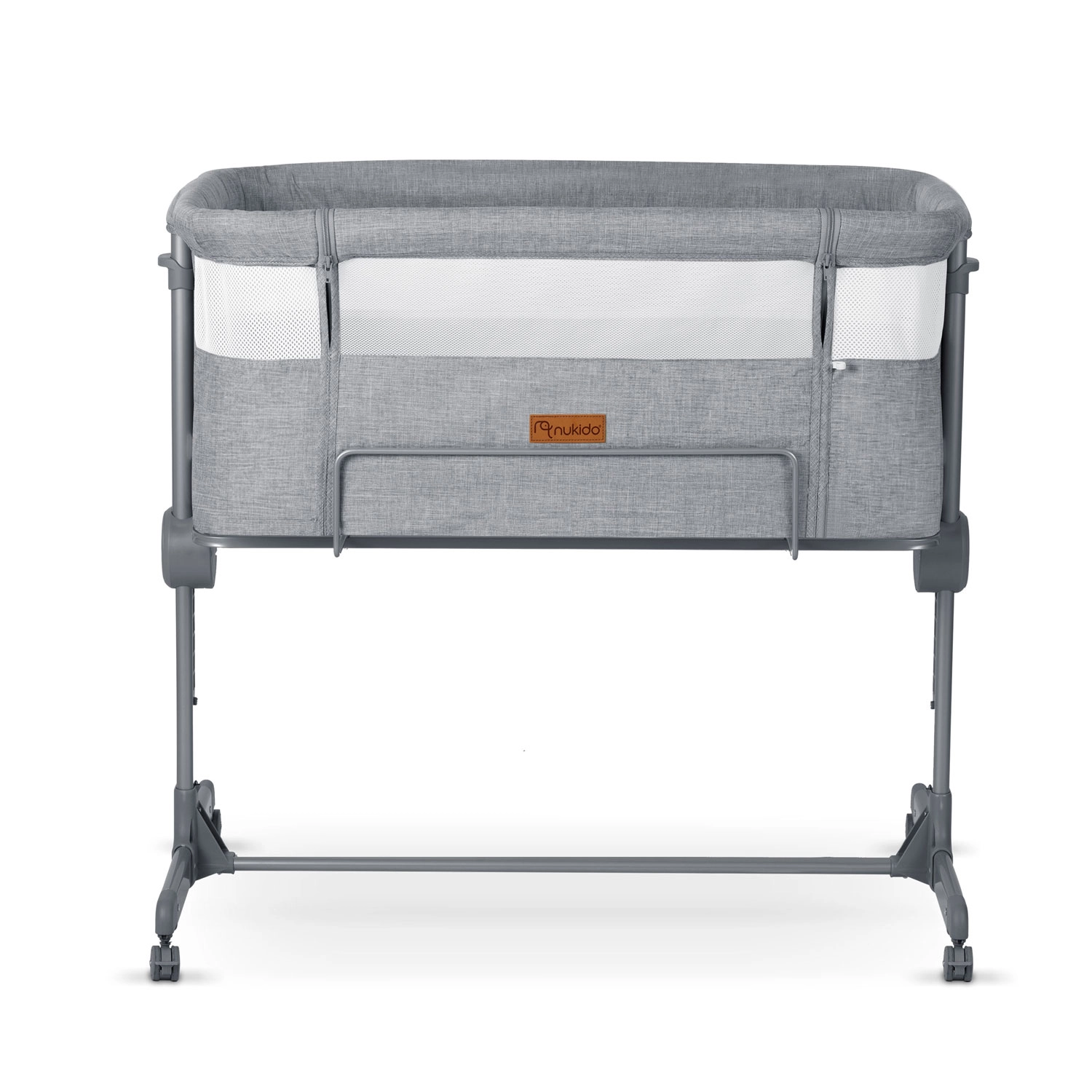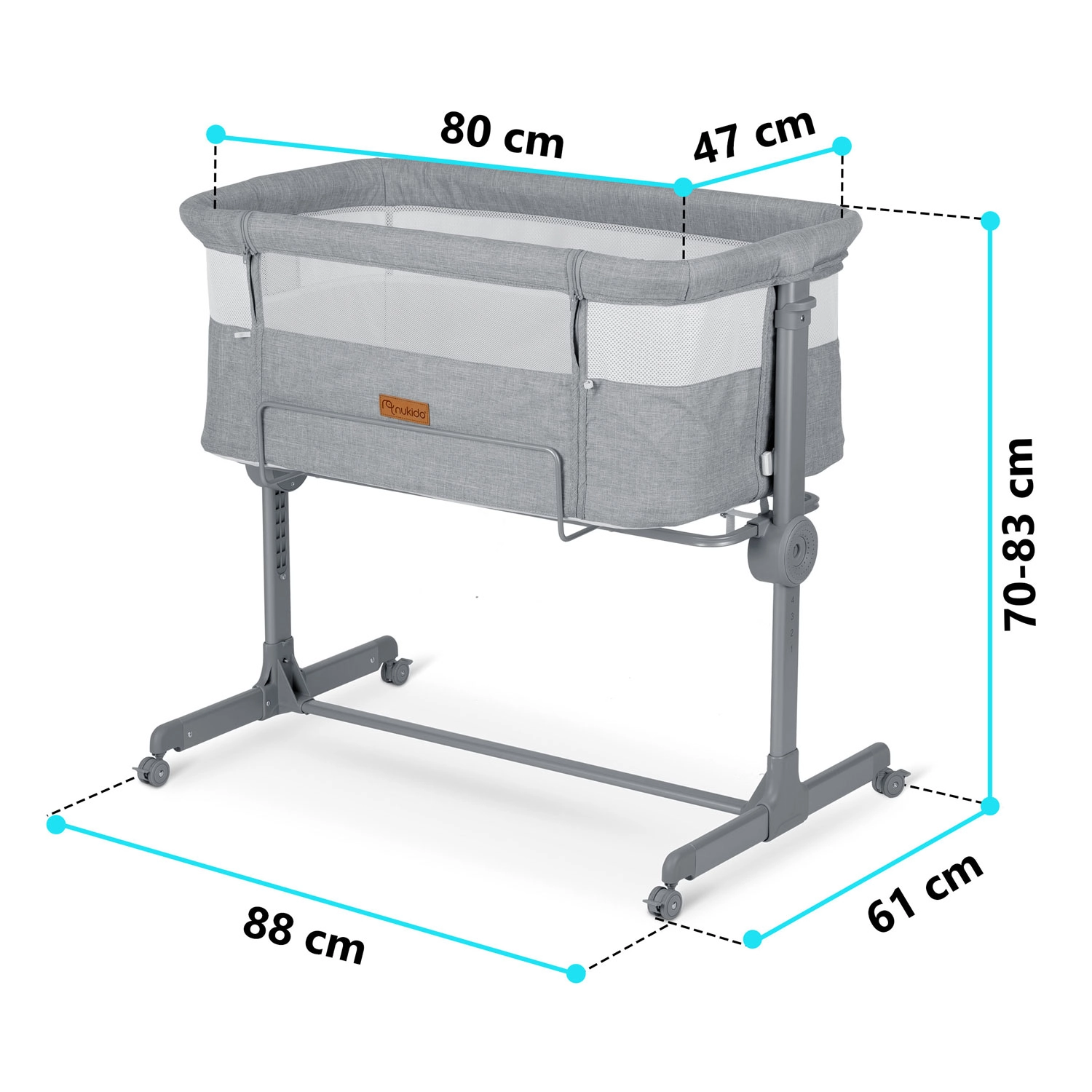 Vďaka nezávislému nastaveniu výšky na oboch stranách jednoducho zarovnáte výšku rodičovskej postele alebo vytvoríte jemný sklon, ktorý môže pomôcť deťom s refluxom. Skladacia konštrukcia, ľahko snímateľný a prateľný poťah aj kolieska s brzdami robia z NUKIDO praktického pomocníka do menších spální aj na cesty.