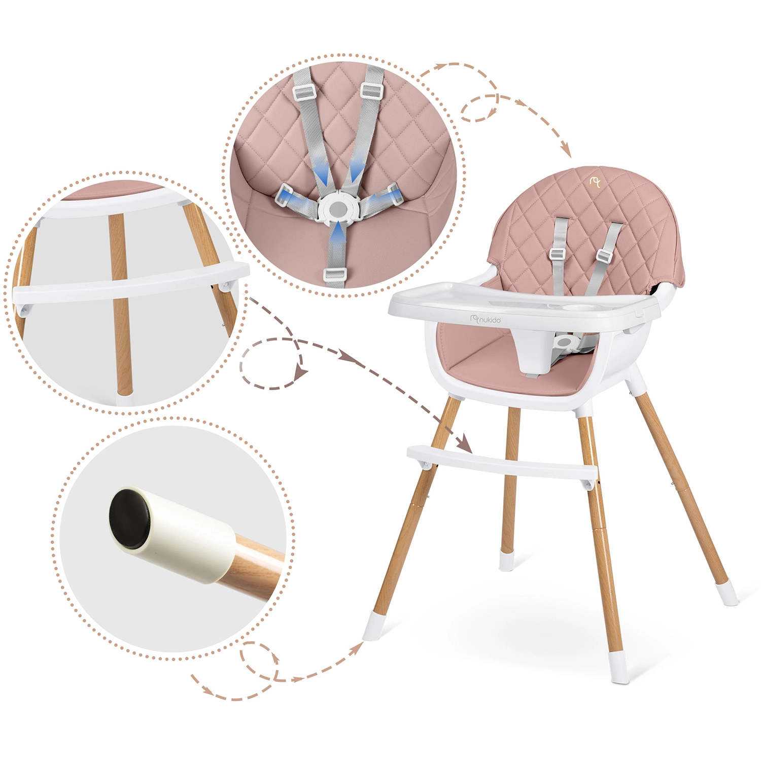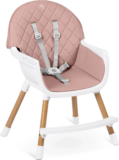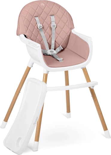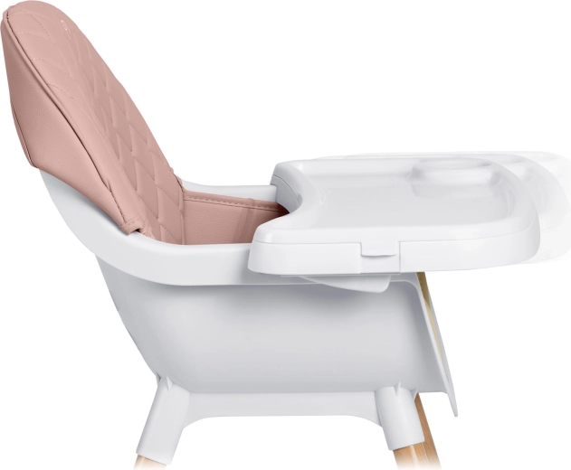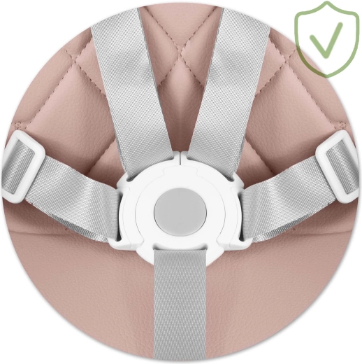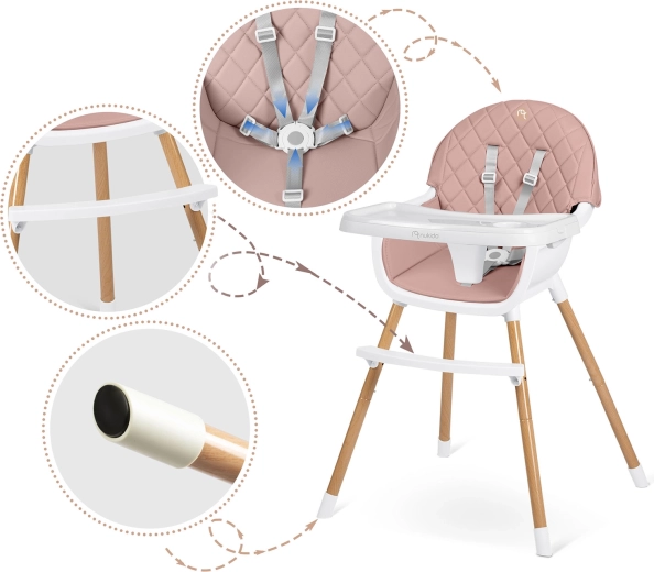 Bezpečie zabezpečujú 5-bodové pásy, stabilné oceľové nohy s drevo dekorom a protišmykové koncovky. Stolička spĺňa prísnu európsku normu EN 14988. Je ideálna nielen na kŕmenie, ale aj na hru, kreslenie a čítanie – dieťa sedí pohodlne a v správnej polohe.