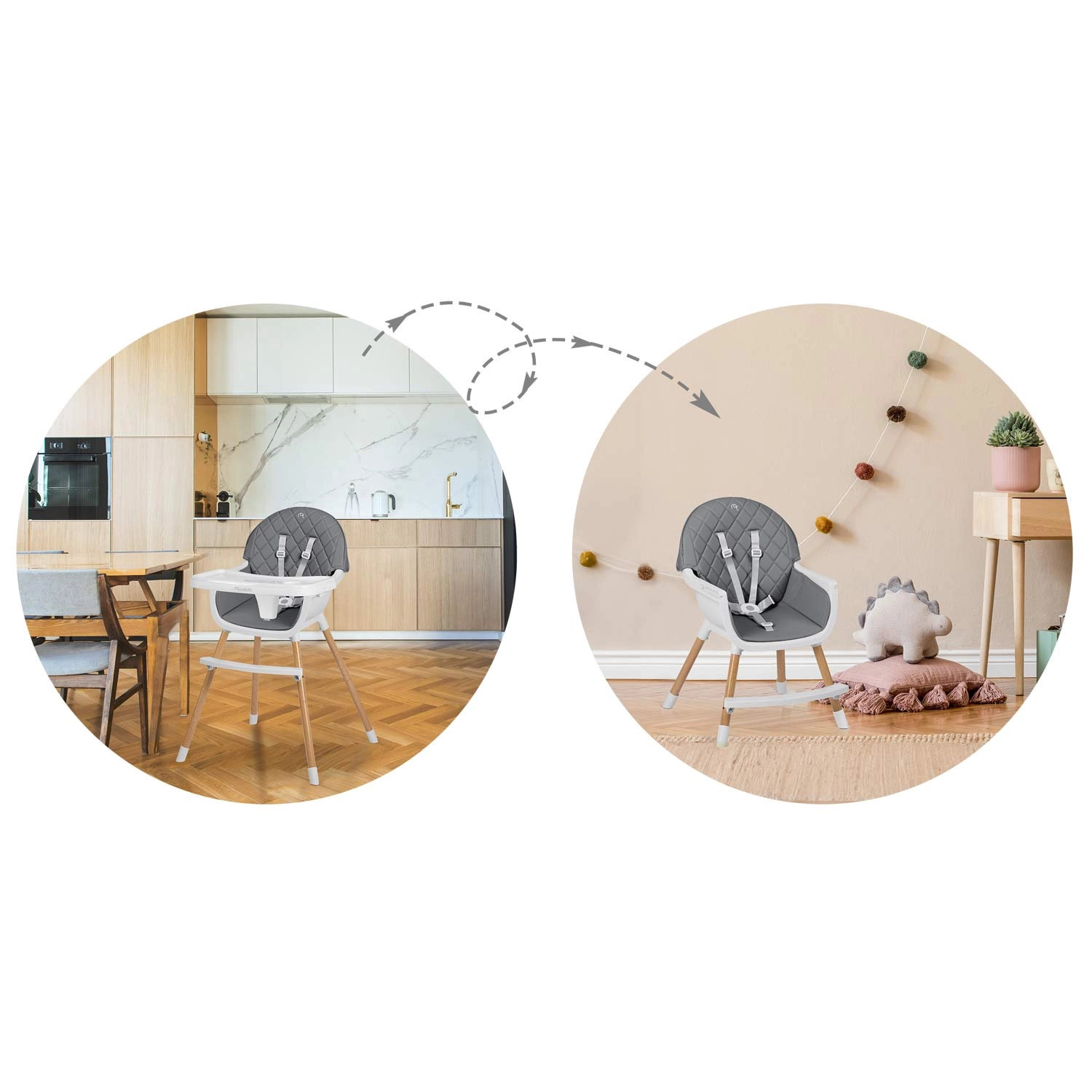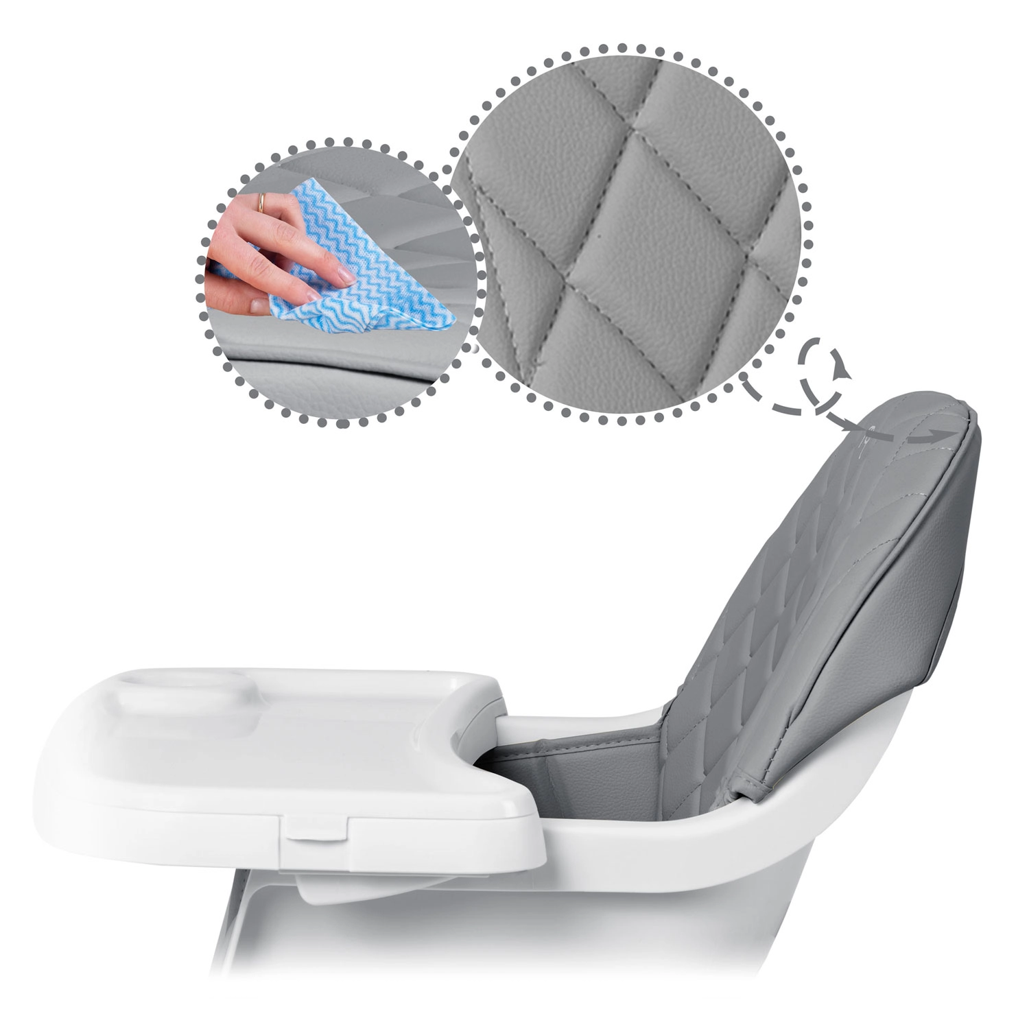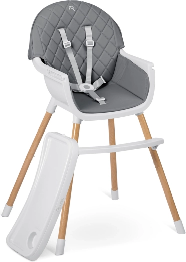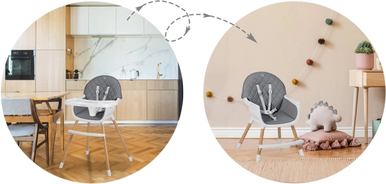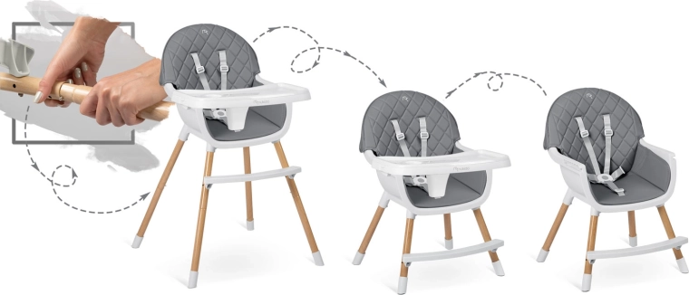 Nastaviteľná a odnímateľná tácka, pevná podnožka a stabilná konštrukcia umožňujú využitie ako vysoká stolička aj nižšie kresielko. Ideálna na kŕmenie, kreslenie, stavanie kociek aj čítanie.
