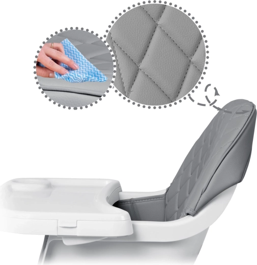Tácka so zvýšenými okrajmi a samostatnou hornou vložkou zachytí neporiadok. Po jedle ju jednoducho zložte a opláchnite alebo vložte do umývačky. Poťah s nevsakujúcim povrchom stačí utrieť handričkou.