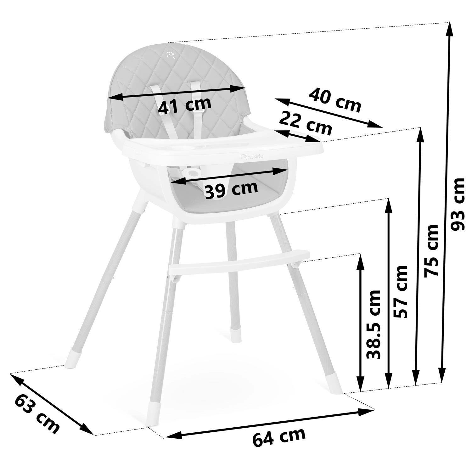 NUKIDO Lilo rastie s vaším dieťaťom – funkcia 3v1 umožní využitie ako vysoké kŕmiace kresielko, pohodlnú nižšiu stoličku aj samostatné sedenie na hranie a učenie. Ergonomický tvar a opora chrbta podporujú správne držanie tela, zatiaľ čo pevná podnožka zvyšuje komfort pri jedení aj aktivitách.