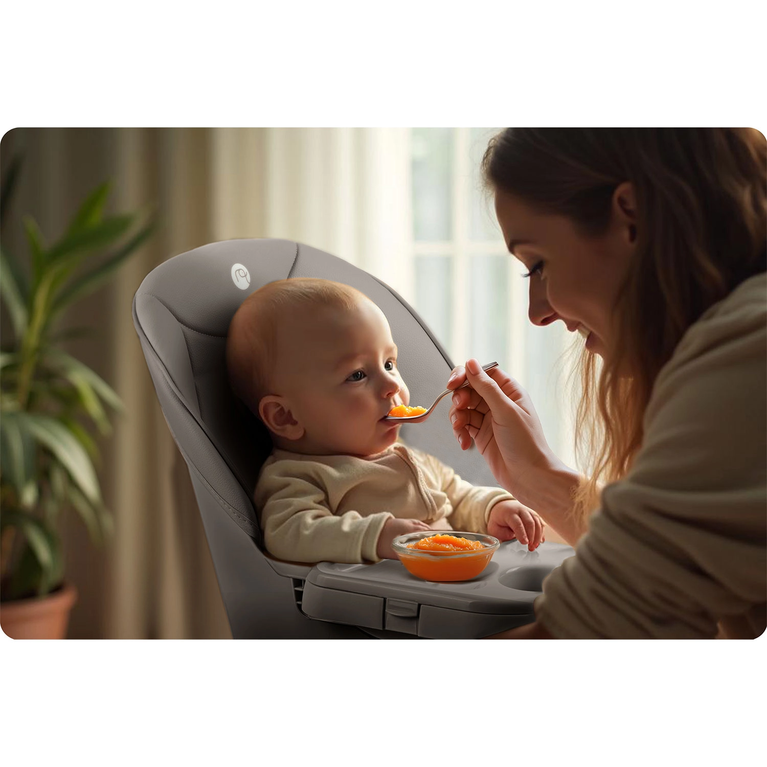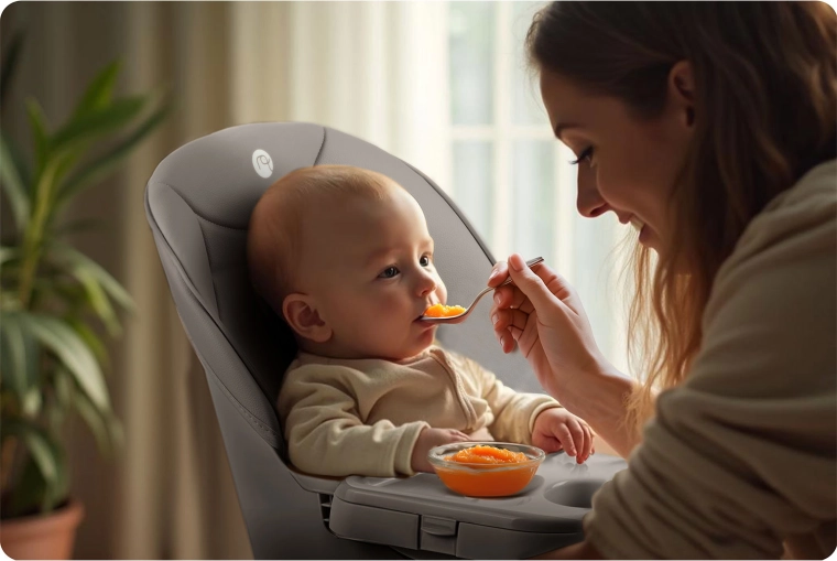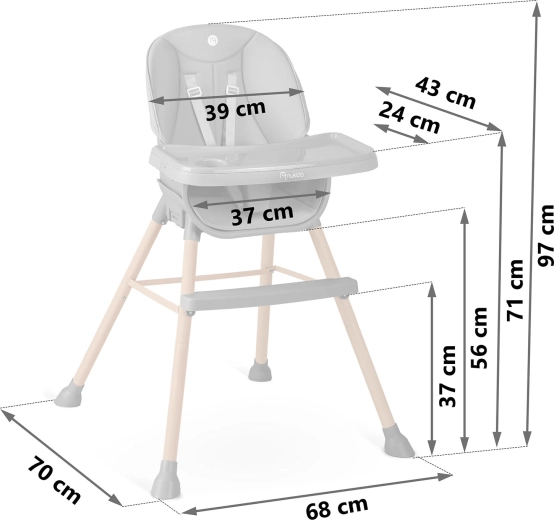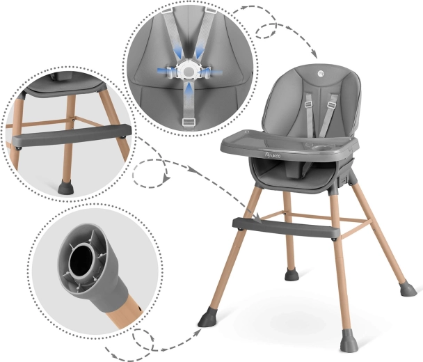 Pre maximálnu bezpečnosť je stolička vybavená 5-bodovým bezpečnostným pásom, stabilnou širokou základňou s protišmykovými koncovkami nôh a pevnou opierkou nôh pre správne držanie tela. Pultík možno približovať/oddiaľovať a v prípade potreby úplne zložiť, aby dieťa mohlo sedieť priamo pri jedálenskom stole.
