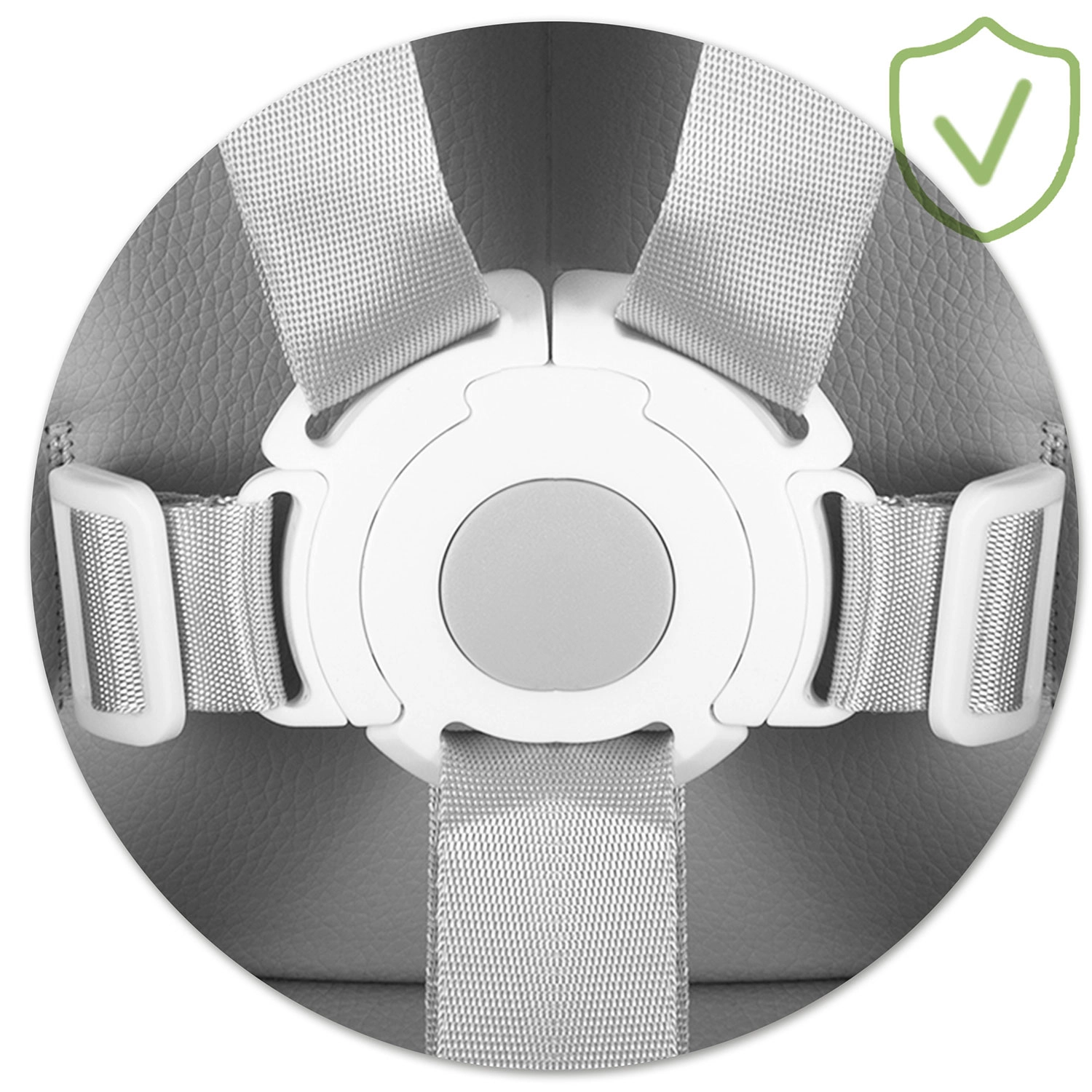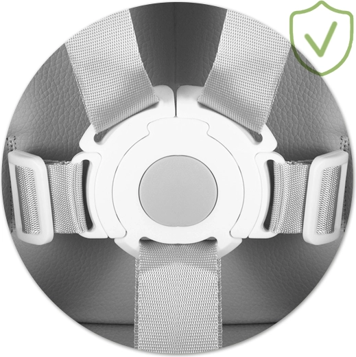 5-bodové pásy, široká základňa a protišmykové koncovky nôh držia stoličku pevne na mieste. Pevná opierka nôh podporuje správne držanie tela.