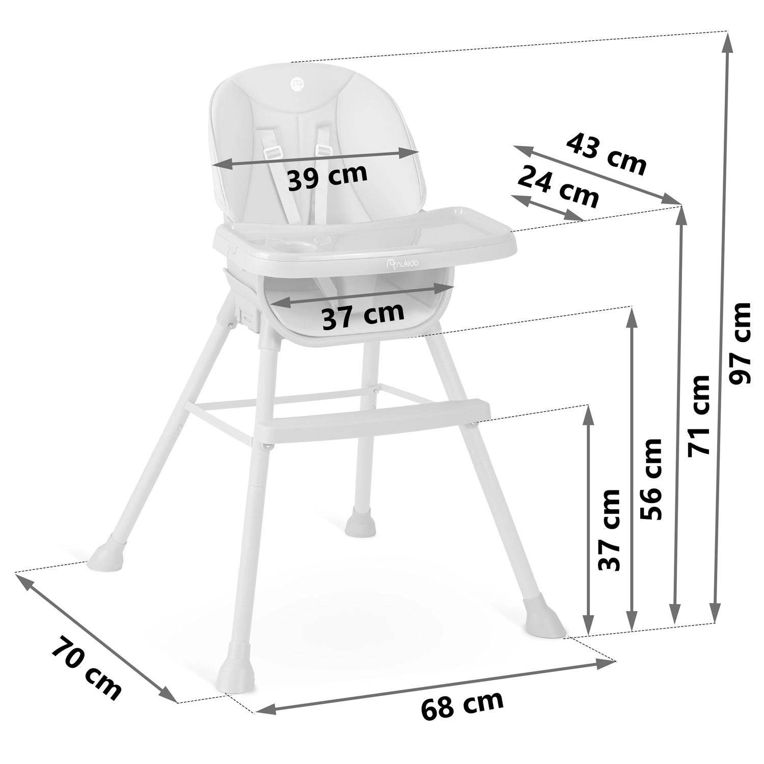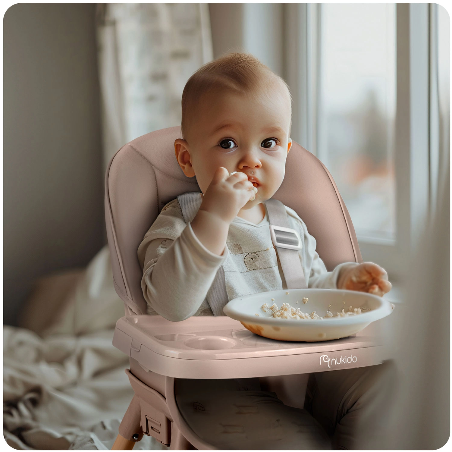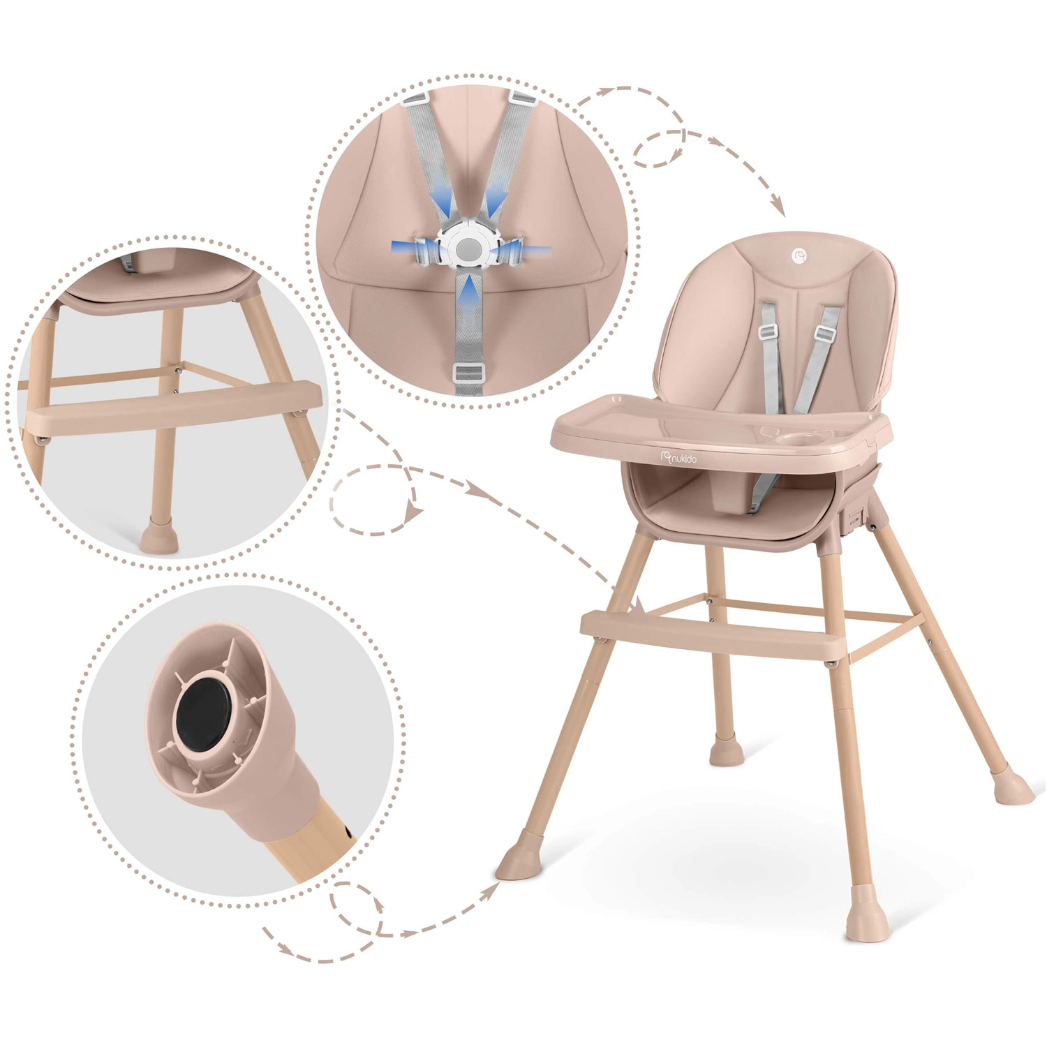 NUKIDO Tilo je všestranné detské kŕmiace kreslo 3v1, ktoré ľahko premeníte z vysokej jedálenskej stoličky na nízku stoličku pre batoľa alebo na samostatné sedátko. Vďaka plynulo nastaviteľnej vzdialenosti podnosu a jeho rýchlo odopínateľnej vložke udržíte poriadok behom chvíľky – vložku stačí zložiť a opláchnuť alebo vložiť do umývačky.
