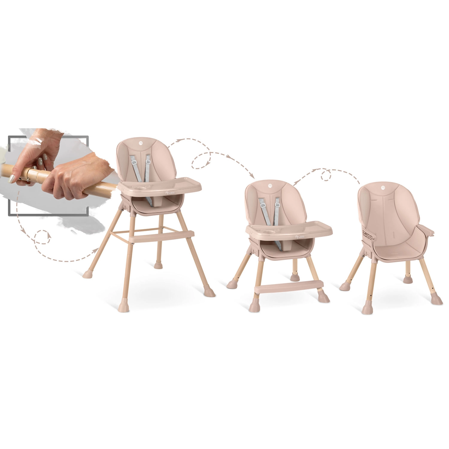 Jedna stolička, tri spôsoby použitia. Prispôsobte NUKIDO Tilo veku a aktivitám dieťaťa – od kŕmenia až po hranie pri stole.