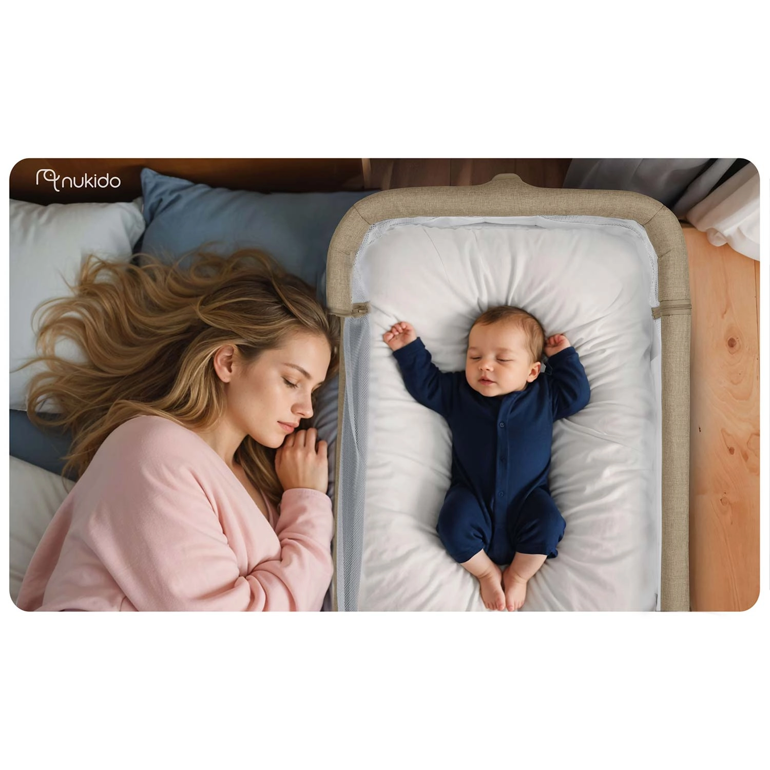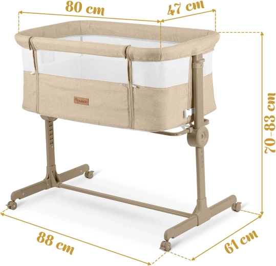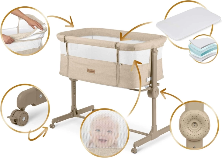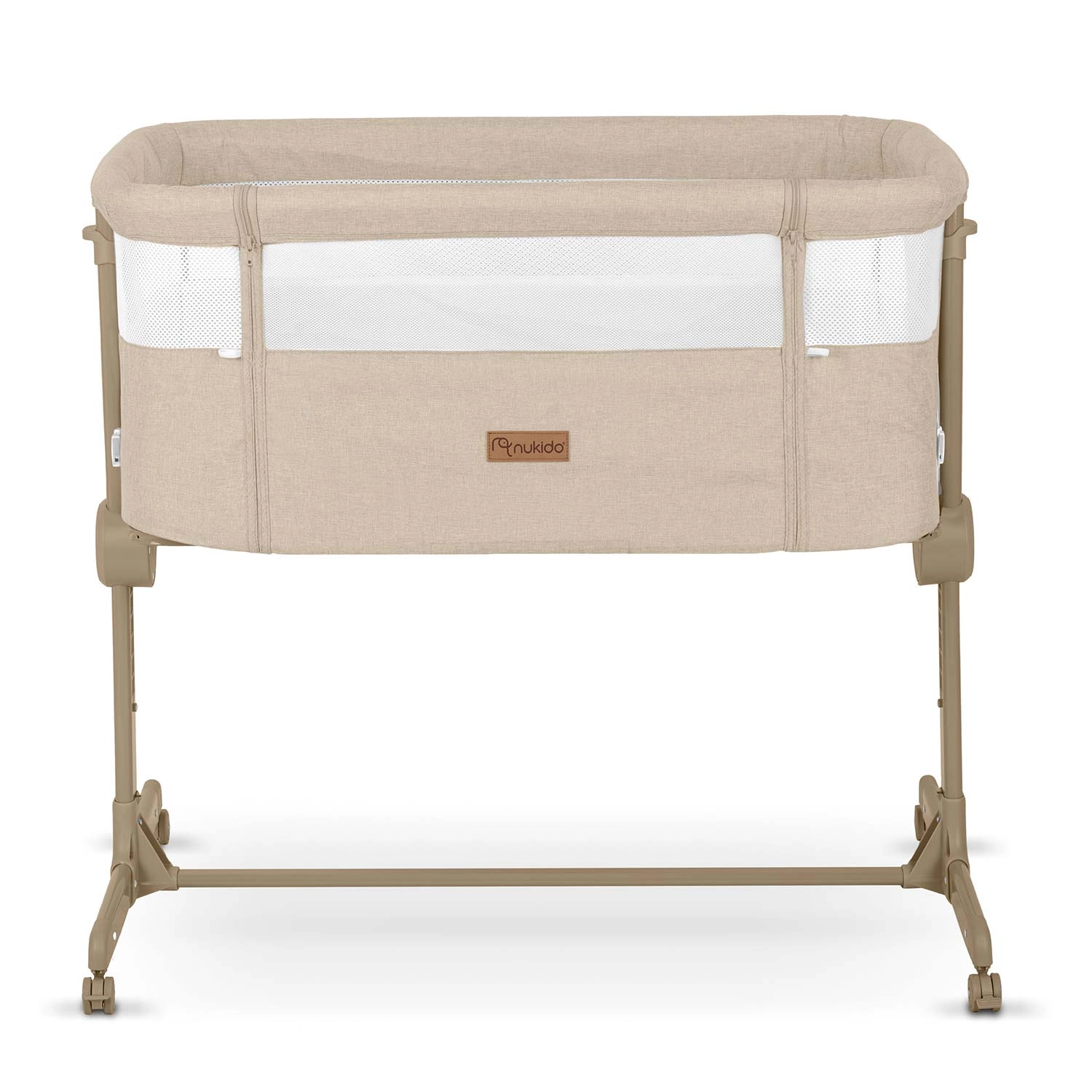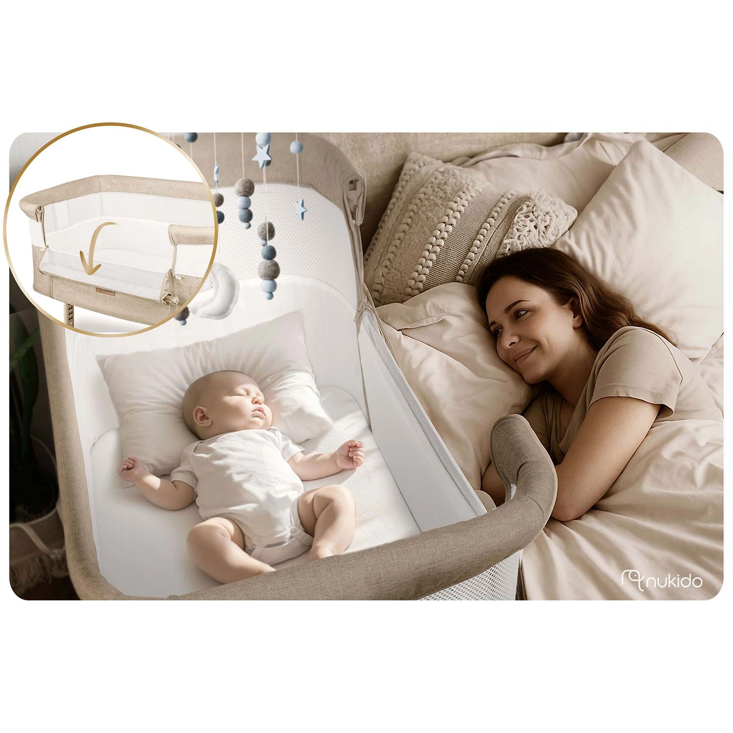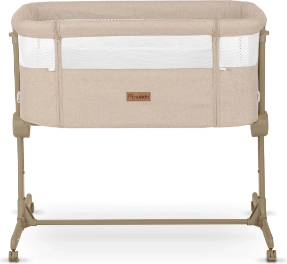 Praktická prístavná postieľka NUKIDO pre novorodencov spája bezpečné spoločné spanie s pohodlnou nočnou starostlivosťou. Ponúka nezávislé nastavenie výšky na oboch stranách (1–7), priedušné sieťované bočnice, skladaciu konštrukciu a 4 kolieska s brzdami. Súčasťou je matrac s prateľným poťahom a upevňovacie pásy na bezpečné prichytenie k posteli rodičov.