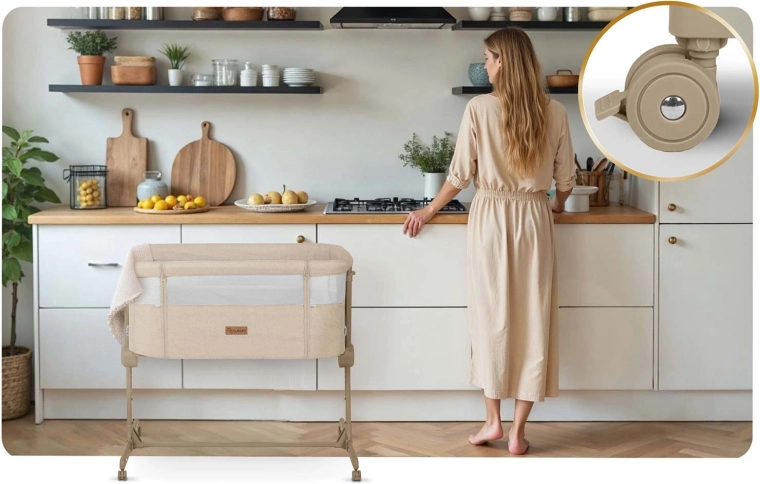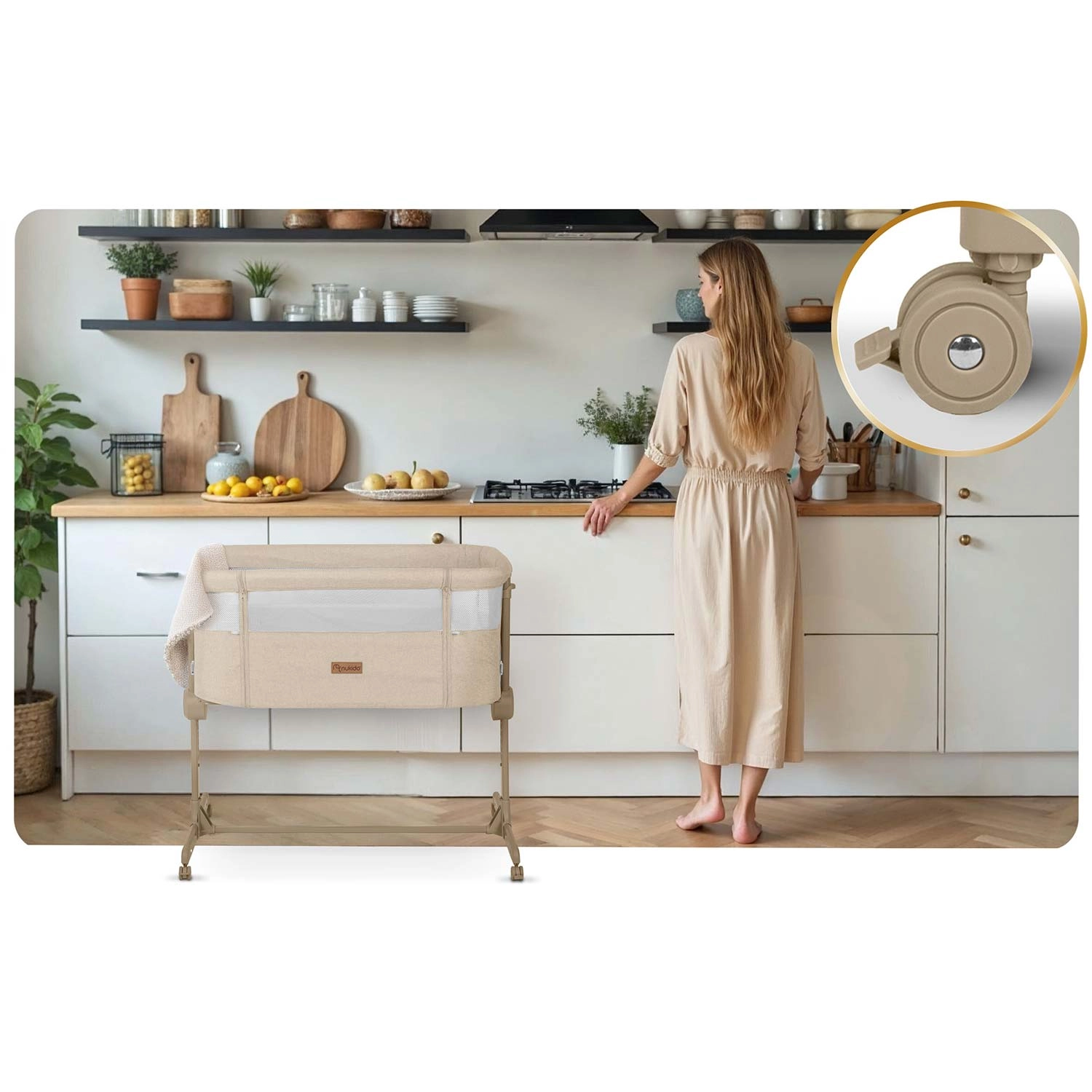 Postieľku zložíte behom chvíľky a vďaka kolieskam s brzdou ju presuniete tam, kde ju práve potrebujete – do spálne, obývačky aj k detskému kútiku. Odnímateľný bočný panel s vonkajším zipsom uľahčuje prístup k bábätku a zároveň bráni jeho nechcenému rozopnutiu zvnútra. Matrac s prateľným poťahom pomáha udržiavať dokonalú čistotu každý deň.