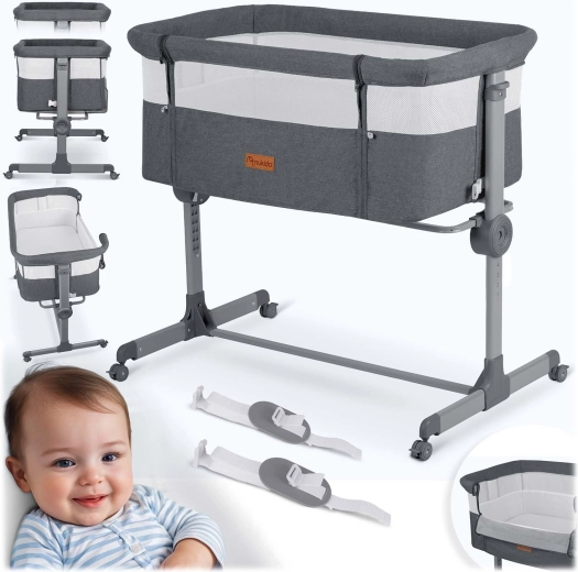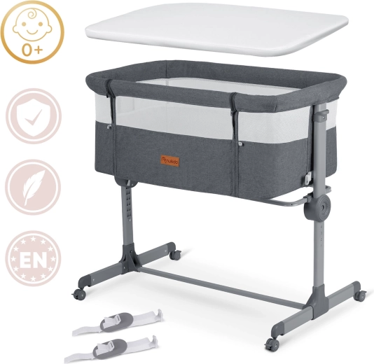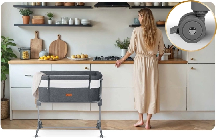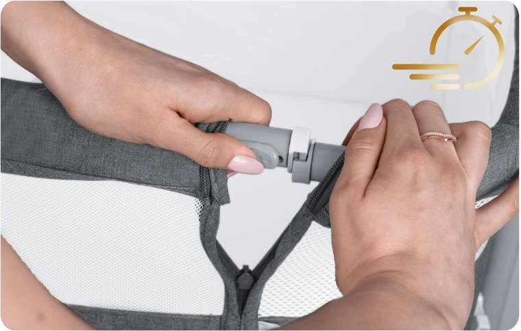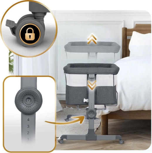 Vďaka nezávislej obojstrannej regulácii si výšku jednoducho prispôsobíte matraci rodičov, prípadne ľahko naklopíte lôžko (praktické pri refluxe). Postieľka sa rýchlo skladá systémom „Quick Click“, má stabilnú konštrukciu, 4 kolieska s brzdami a odnímateľný bočný vstup na zips pre jednoduché pristrčenie k posteli.