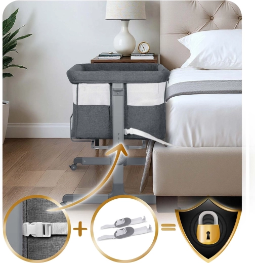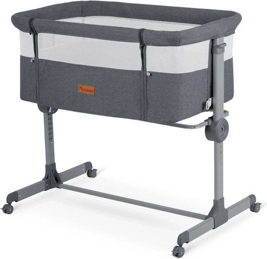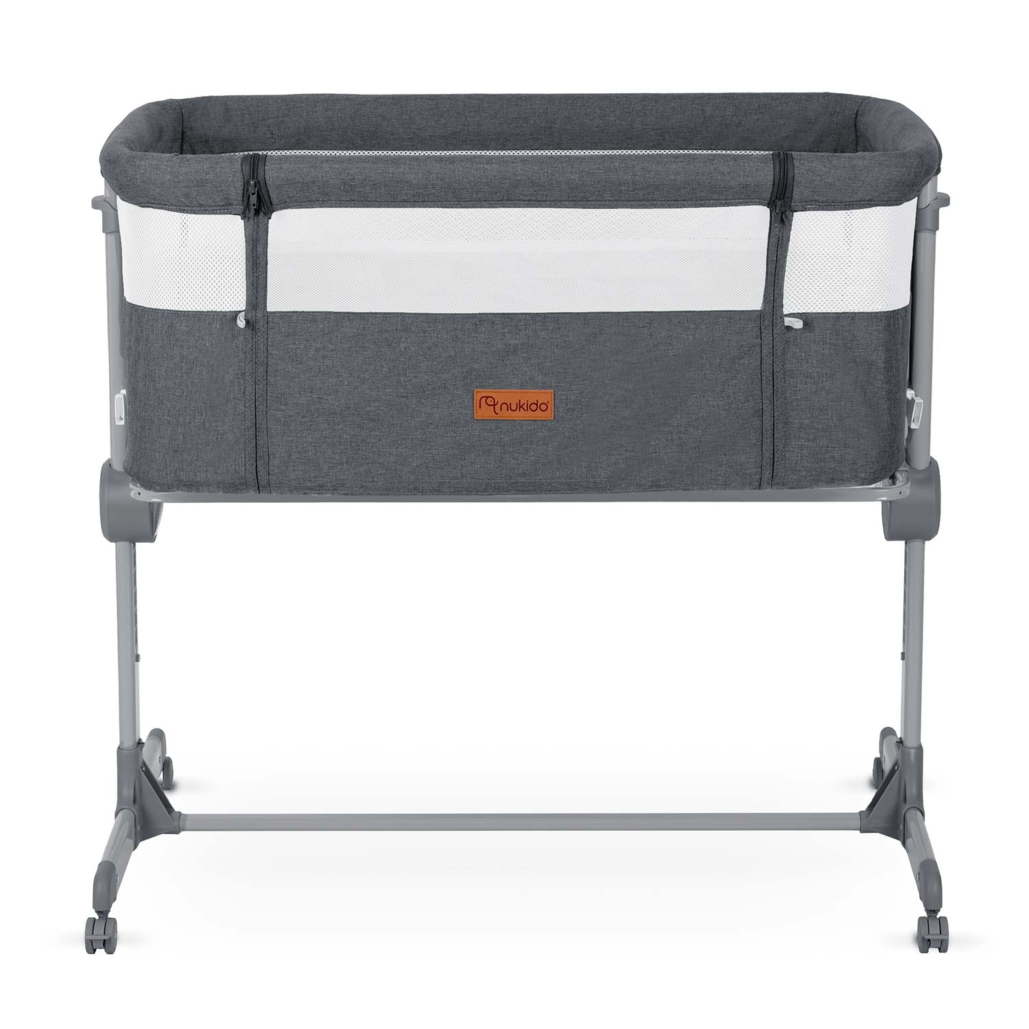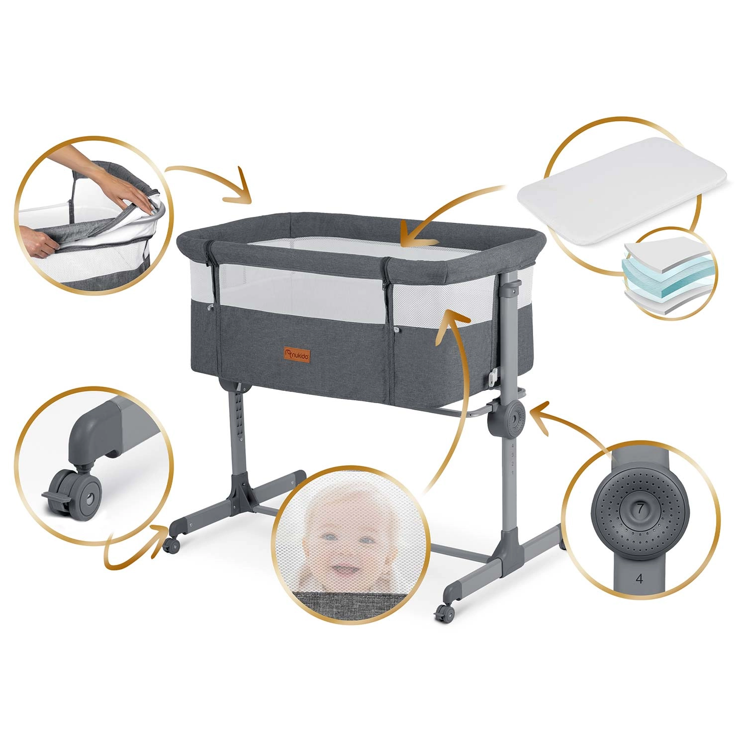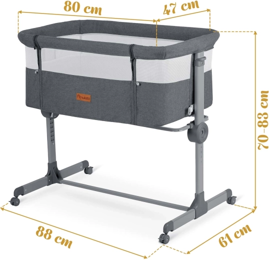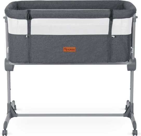 Praktická prístavná postieľka NUKIDO ponúka bezpečný spánok nablízku, 7-stupňovú výškovú reguláciu s možnosťou nezávislého nastavenia oboch strán, skladaciu konštrukciu na cestovanie a 4 kolieska s brzdou na jednoduché presúvanie. Súčasťou je matrac s prateľným poťahom a upevňovacie pásy na pevné spojenie s lôžkom rodičov.