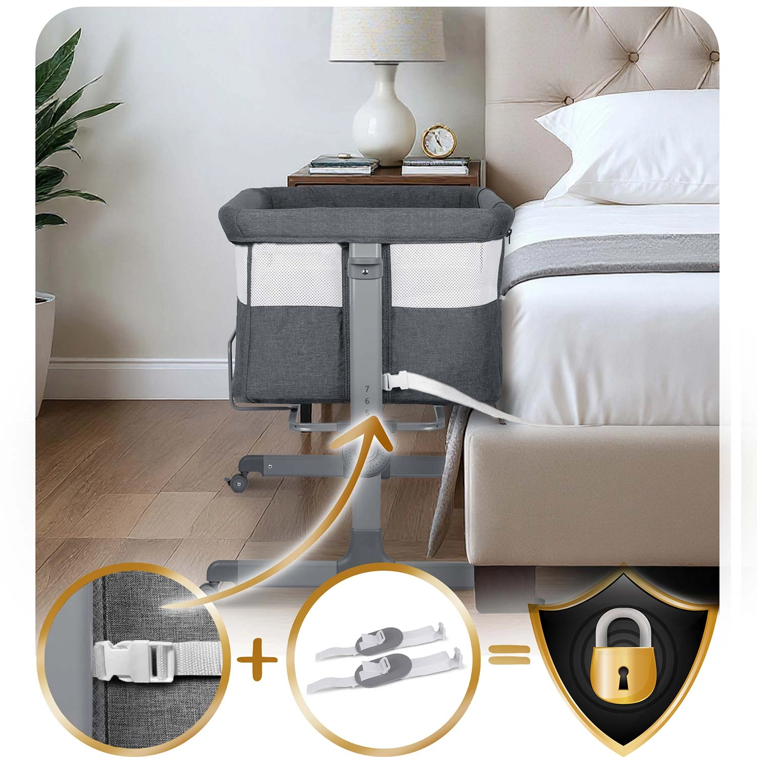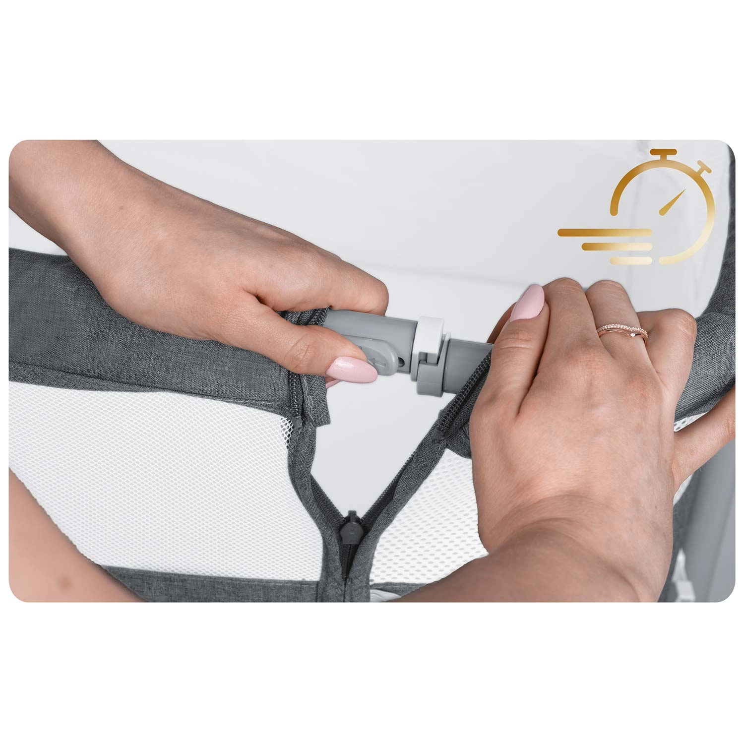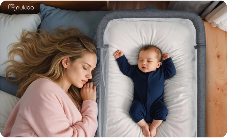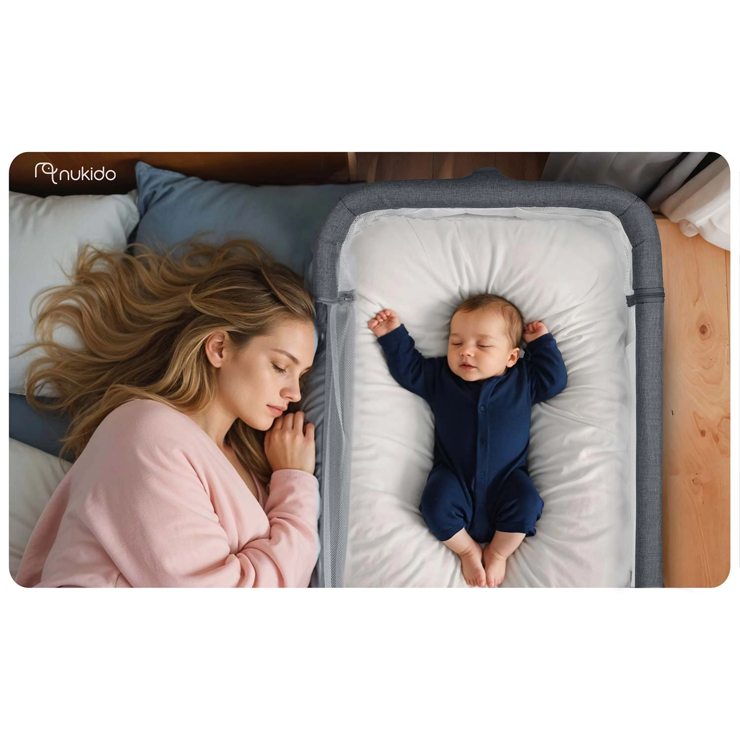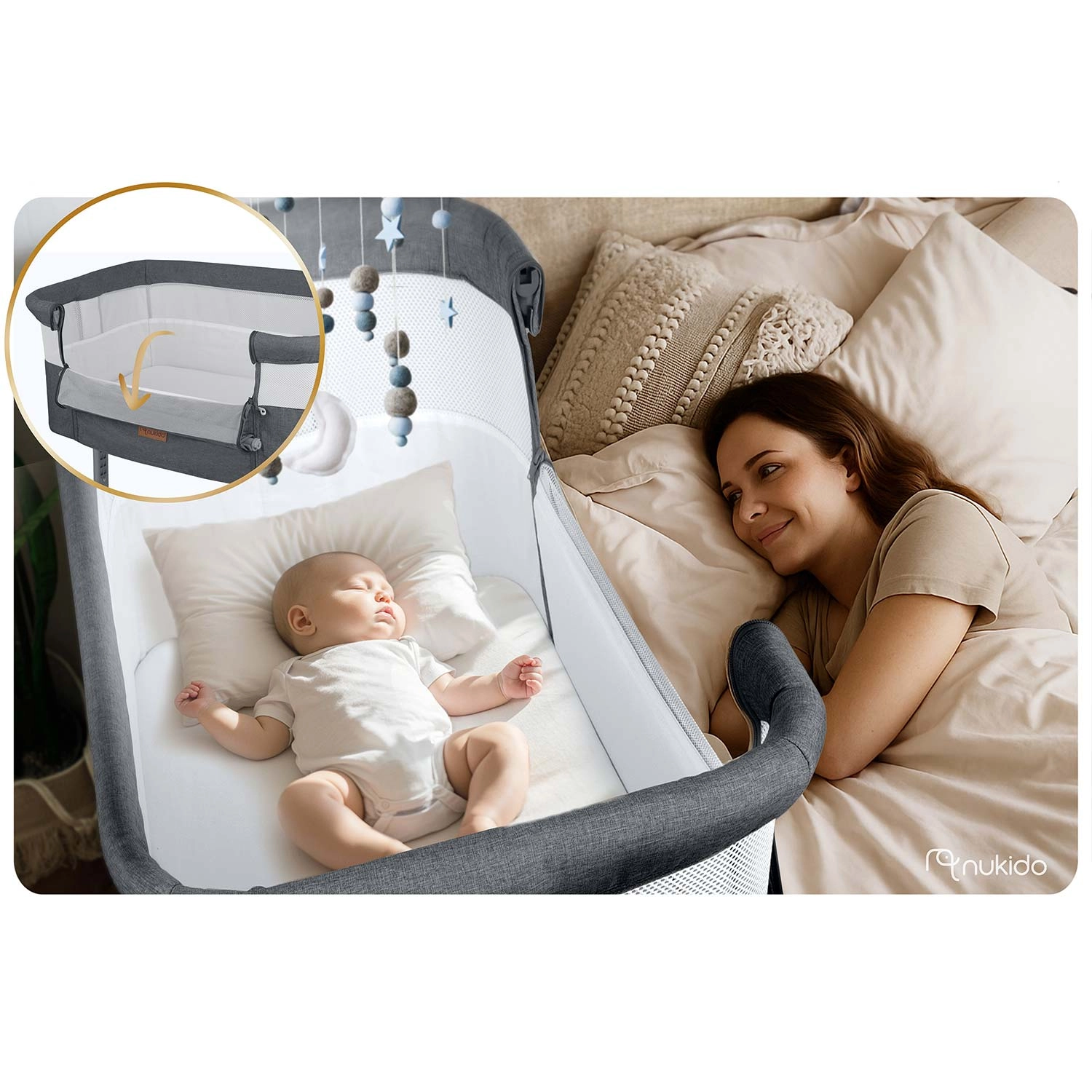 Privádzajte si bábätko bezpečne na dosah ruky. Prístavná postieľka NUKIDO zabezpečuje komfortné a pokojné noci – dieťa je nablízku, ľahko ho nakojíte aj utíšite bez vstávania. Priedušné sieťované bočnice zvyšujú cirkuláciu vzduchu a umožňujú stály očný kontakt.