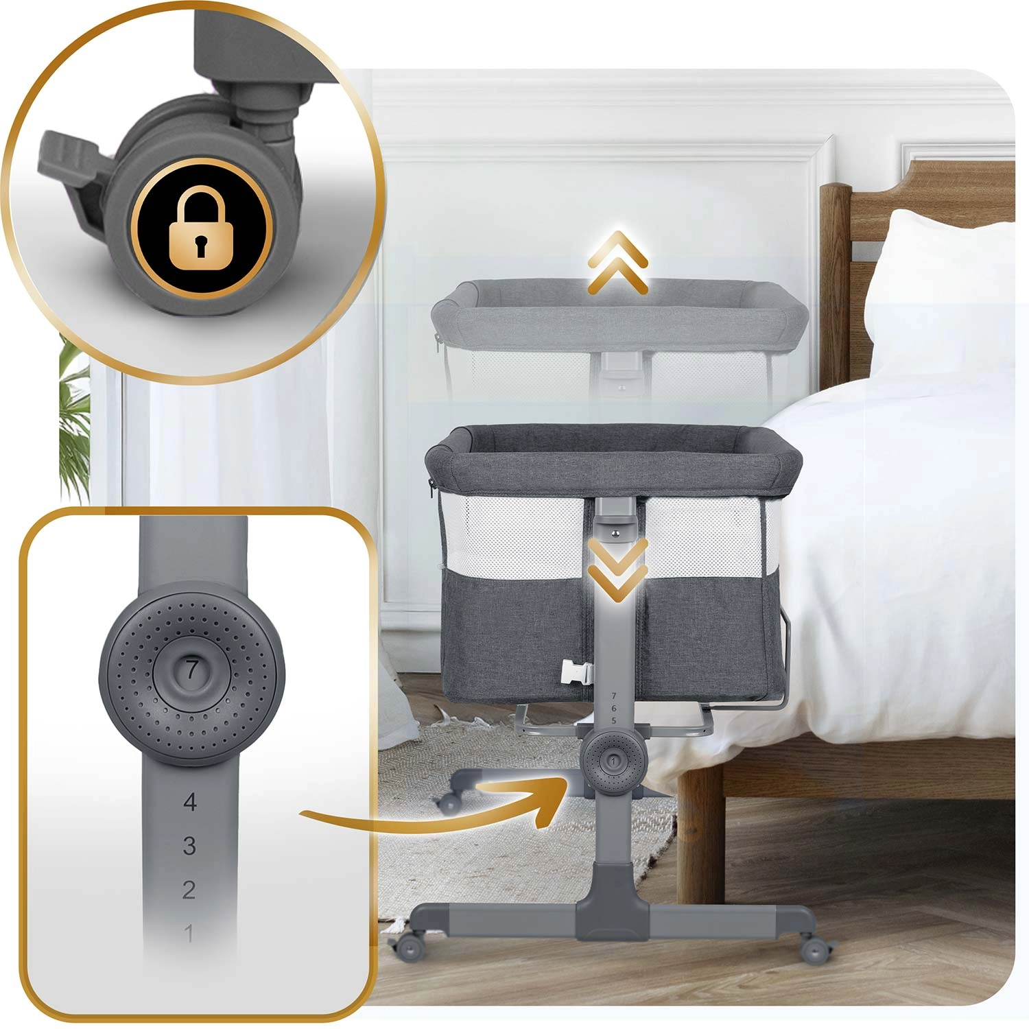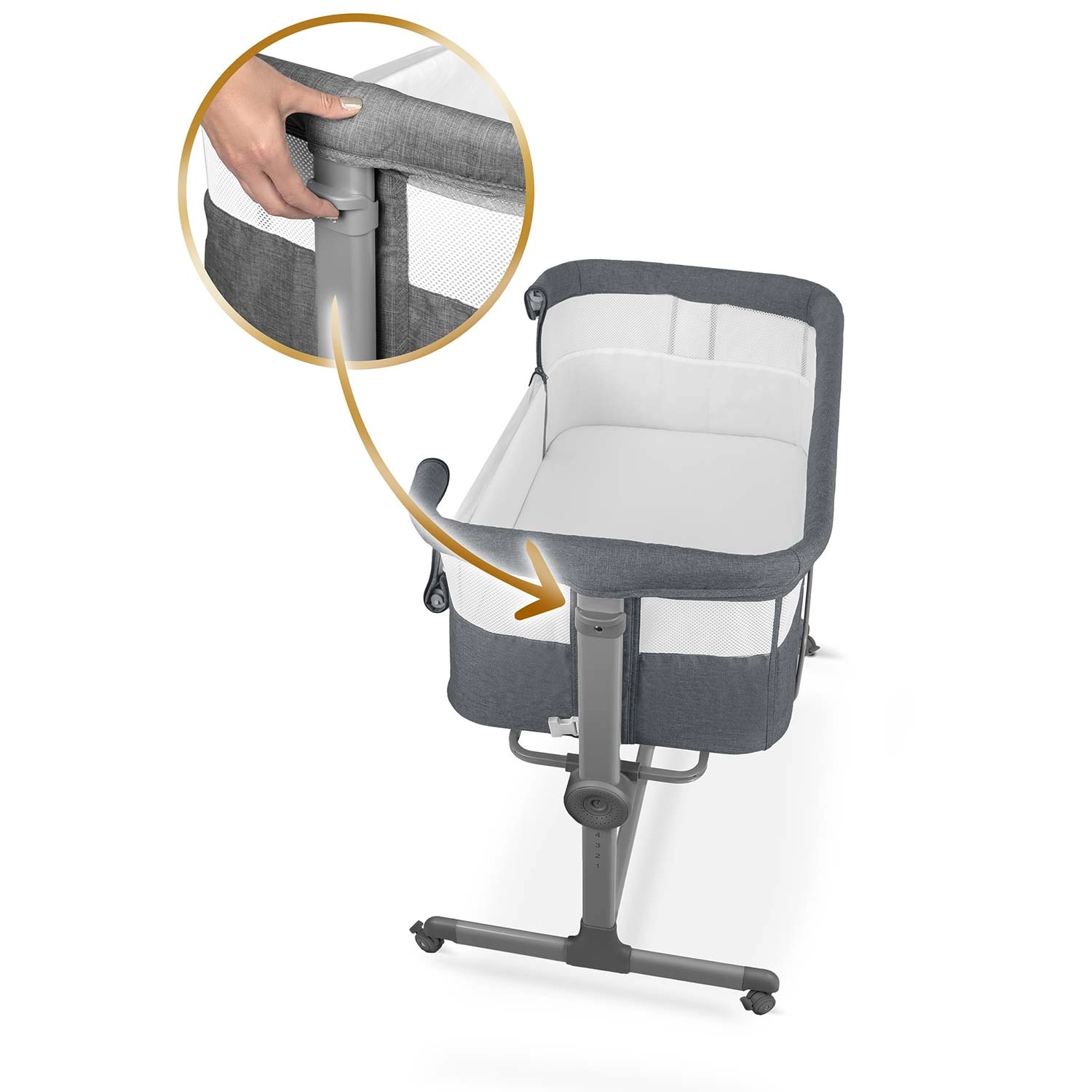 Prispôsobte postieľku výške vlastnej matrace alebo vytvorte jemný náklon pre pohodlie bábätka. Regulácia prebieha rýchlo a iste, jedným pohybom.